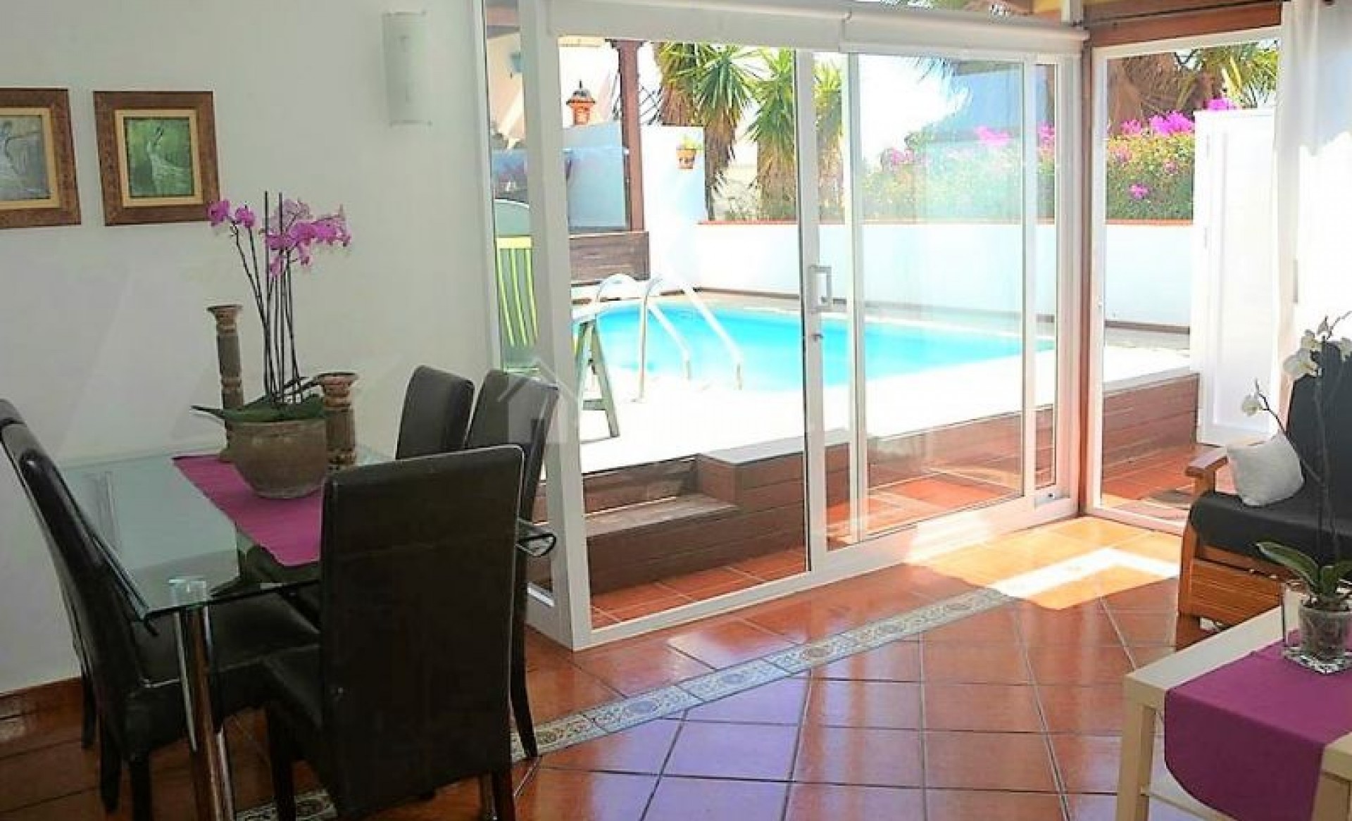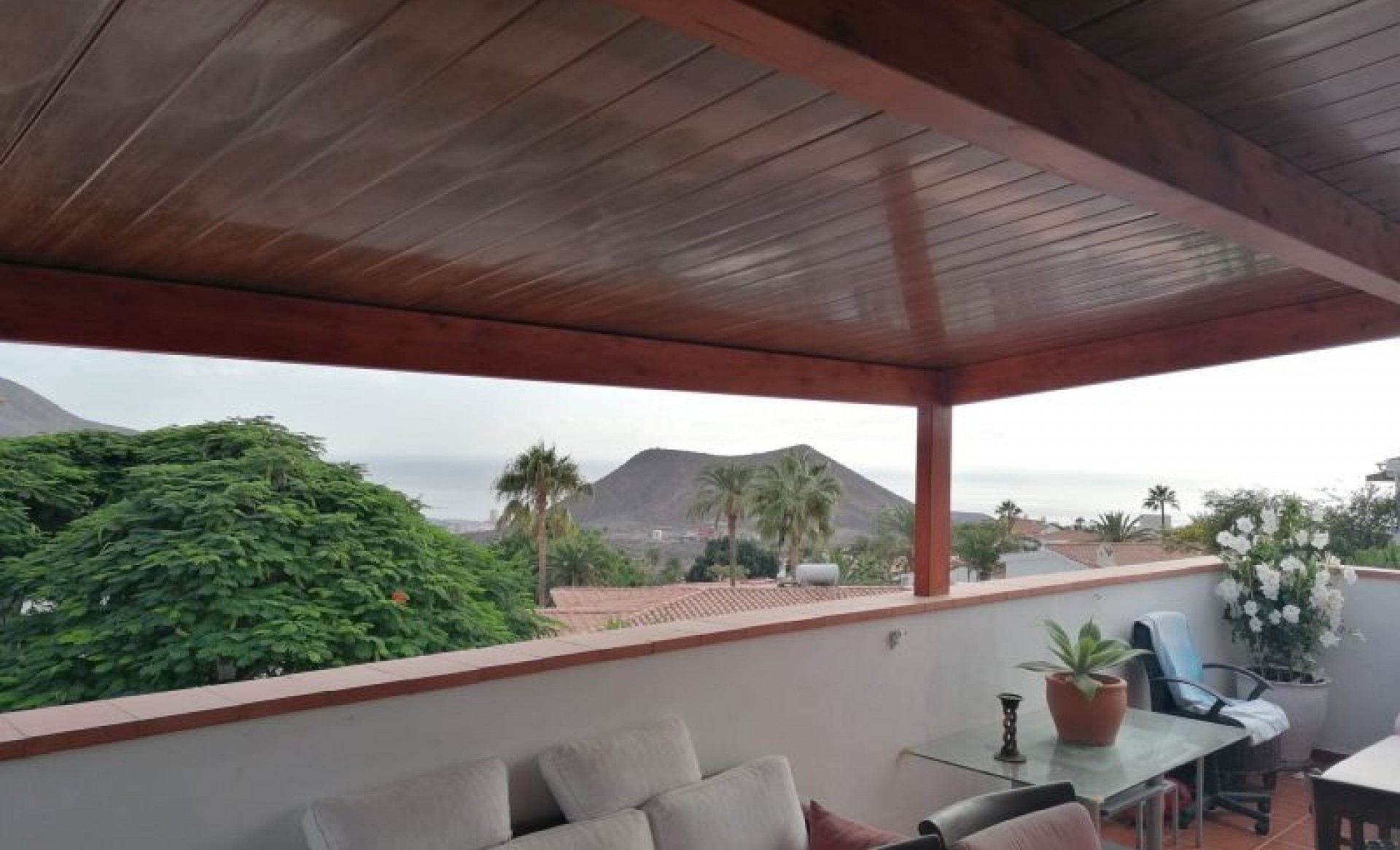 For sale: a unique investment opportunity in Chayofa, just above Los Cristianos, close to the beach and the Las Américas golf course. This exceptional property consists of a large plot with three fully furnished houses, beautiful sea views, lush gardens with subtropical plants, and a peaceful setting. • Garden apartment: At street level, with a semi-covered garage, a spacious garden, 2 bedrooms, 2 bathrooms, a fully fitted American-style kitchen, and a comfortable living room. (Currently rented long-term.) • Villa with heated private pool: Upstairs, this villa offers 2 spacious bedrooms with fitted wardrobes — one with a dressing room and spa-style bathroom with hydromassage bath and separate shower, the other with a sauna and shower. Includes an independent modern kitchen, a bright living room, and a private garden with barbecue and fruit trees. (Currently in holiday rental.) • Second villa with spectacular views: A spacious living room, open-plan modern kitchen with cooking island, 2 bedrooms with fitted wardrobes, 2 bathrooms, and two terraces — one with fantastic sea views. All houses are in a quiet area, fully furnished, and the complex features a heated communal pool. The complete set of 3 houses and garage is included in the sale.