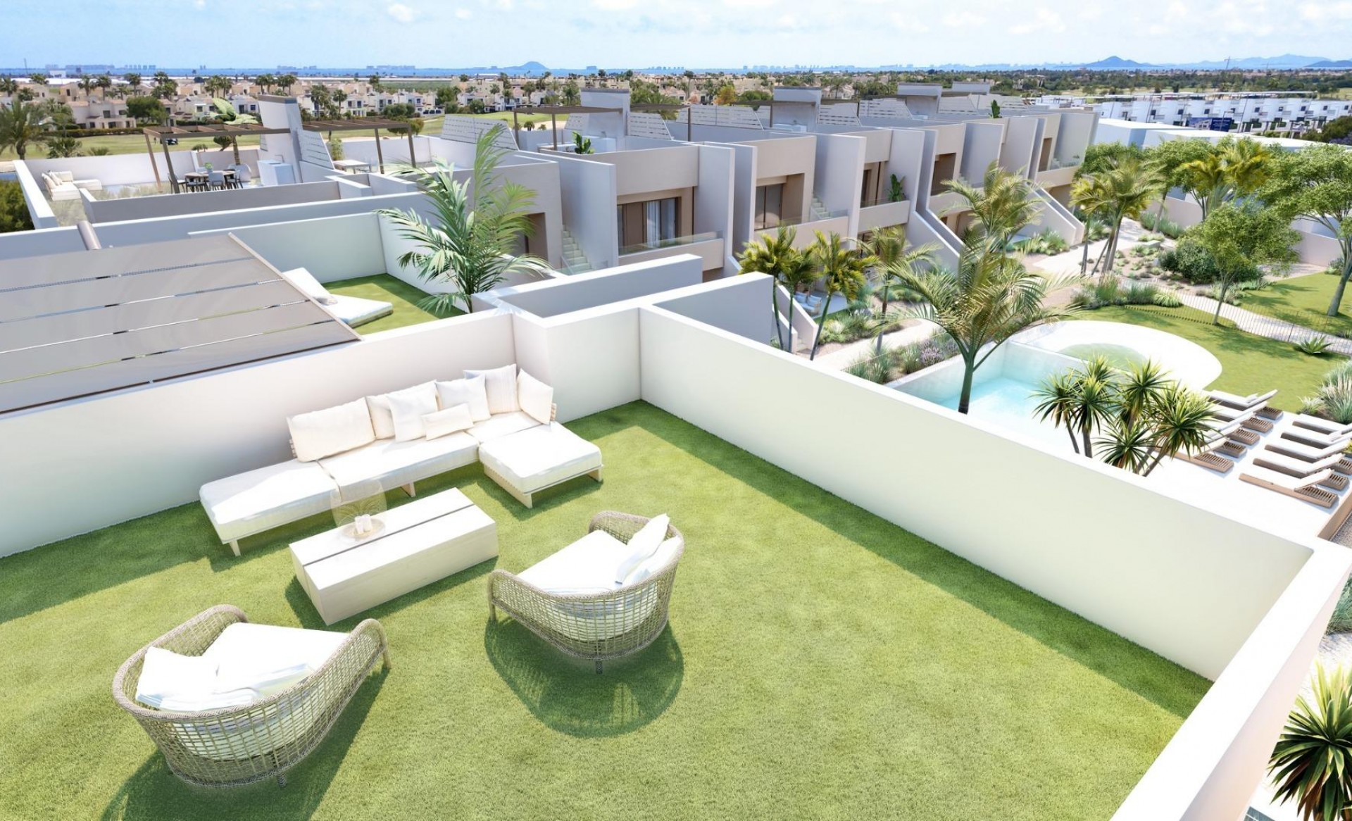 New Build residential complex located on a south-facing plot inside the prestigious Roda Golf & Beach Resort, bordering the course with its manicured fairways and feature lakes.This beautiful complex comprises 37 spacious homes surrounding a stunning pool and communal gardens. This modern residential offers a range of property types, views and orientations, according to your requirements. All bungalow apartments boast 3 double bedrooms, 2 bathrooms, a light and spacious open-plan living-dining room with American kitchen and fantastic outside space. All include off-road parking and a private storeroom. The 18 ground floor bungalows enjoy an interior terrace and garden which lead out to the communal gardens and pool area, as well as a large, gated rear terrace and garden.The 18 penthouses include a front balcony off the living room, as well as a fantastic, 90m2 private roof solarium with summer kitchen. Residential complex has been designed to maximise the use of space and light. Superbly built and including a wide range of extras, this exclusive promotion is a real oasis on Spain´s Costa Calida. At the heart of the development lies a stunning communal pool area, surrounded by Mediterranean vegetation. Enjoying sun all day long thanks to its south facing orientation, it is the perfect place to swim, relax and soak up the Murcian sunshine. As well as enjoying fantastic inside space, the ground floor properties boast a beautiful front terrace plus additional, private garden that leads out into the interior of the development with its stunning communal gardens and pool area. In addition, they offer a back terrace and enclosed garden for maximum privacy, with a gate that leads out to the exterior of the urbanisation. The duel orientation ensures that the homes enjoy sun and shade all day long. A beautifully maintained, Dave Thomas designed 18 hole course with lakes, strategically placed bunkers, undulating greens and lush Mediterranean vegetation. A private resort with 24 hour security, its own taxi rank, a stunning club house with a la carte restaurant, gym with lake views and sports area. And all this just a stroll or cycle ride away from the beaches and tranquil waters of the Mar Menor inland lagoon. This residential has a fantastic selection of golden sandy beaches on its doorstep, as well as a a wide range of watersports. Enjoy both the Mar Menor and the Mediterranean seas from this paradise on the Murcian coastline.