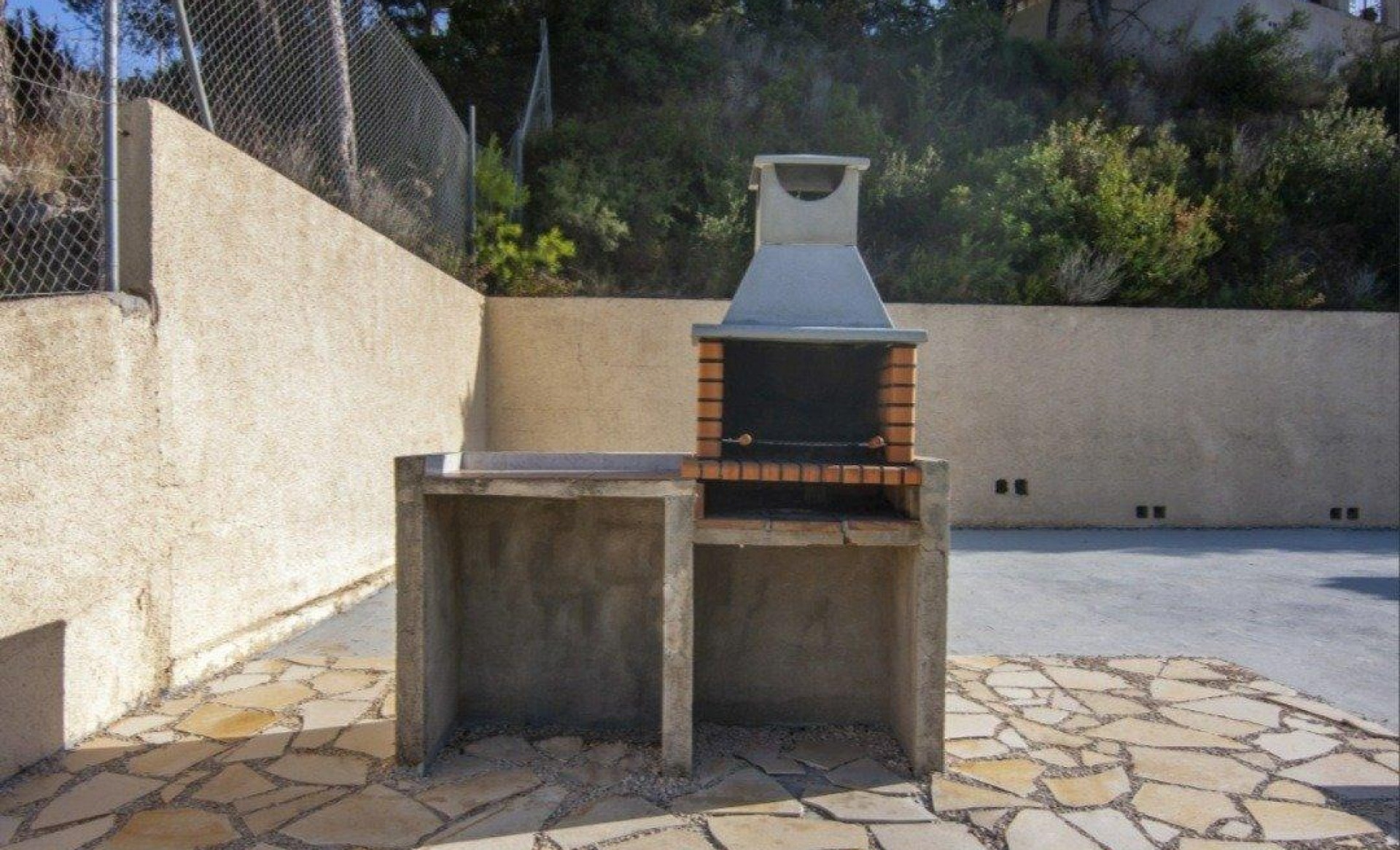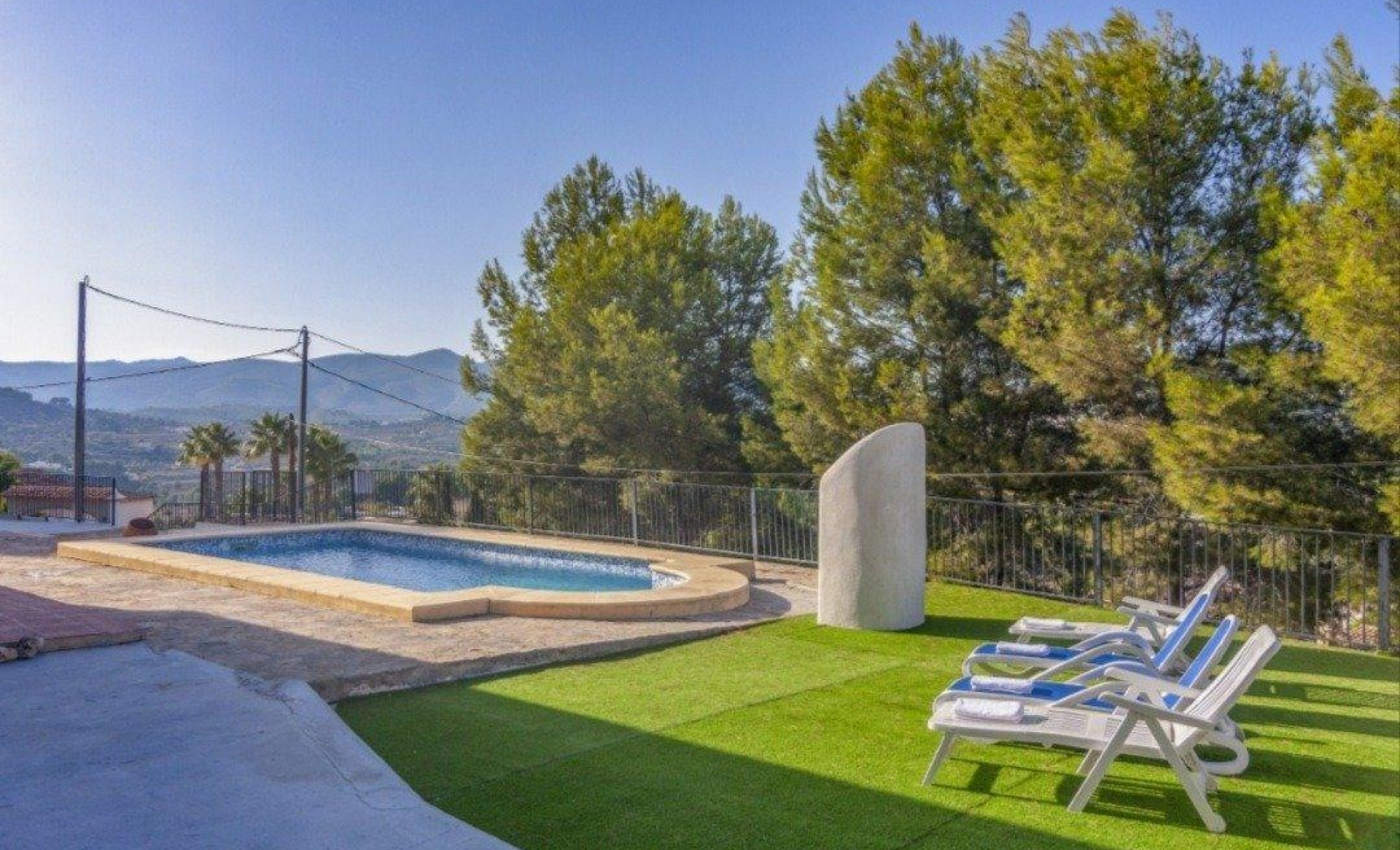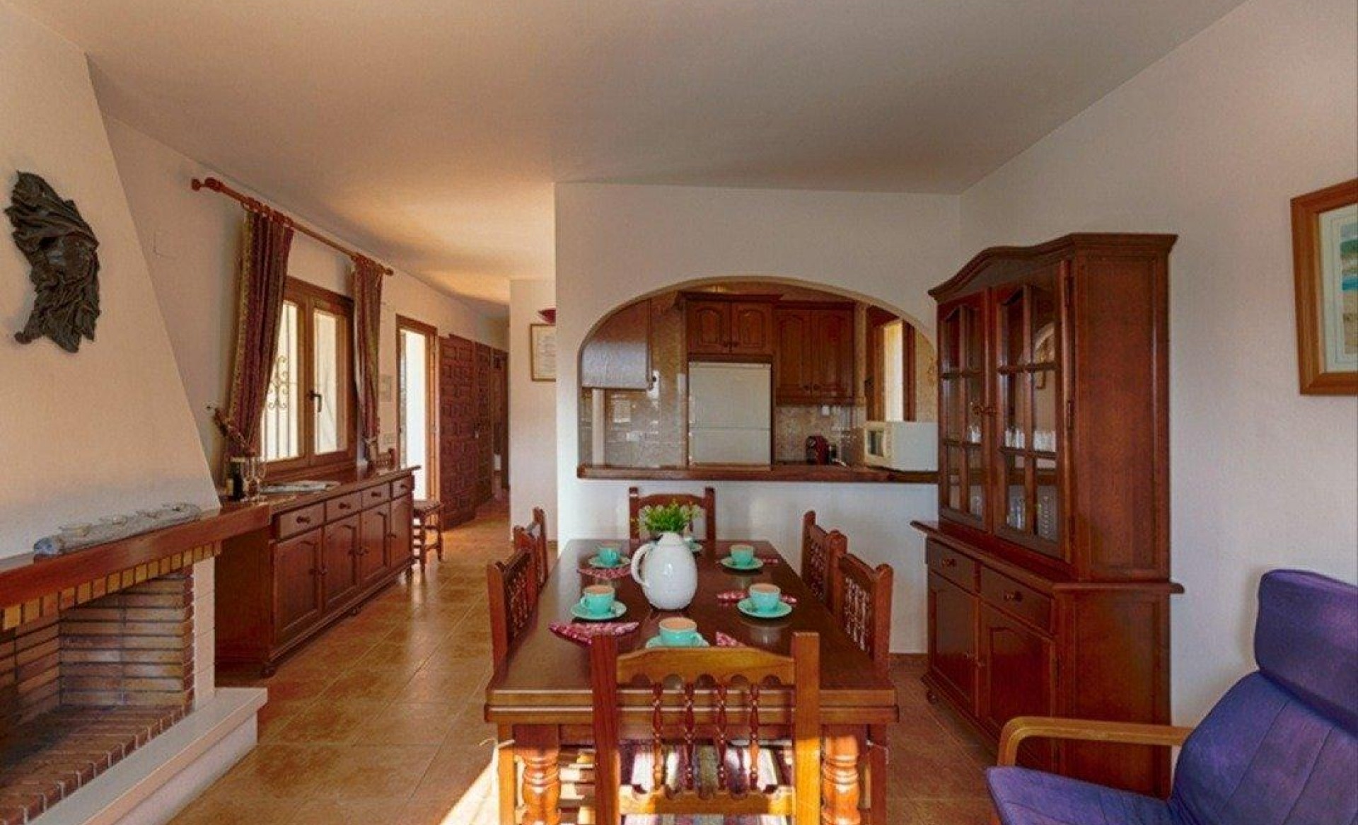 Single-level Mediterranean villa for sale in Calpe, Costa Blanca. The property offers 3 bedrooms, 1 bathroom, a guest toilet, and an open-plan living/dining area with a fireplace. The kitchen is integrated into the main space. Outside, there is a well-maintained garden with a private swimming pool and barbecue. Located in a quiet residential area with panoramic views of the surrounding nature. Ideal for those seeking privacy and proximity to local amenities and beaches. Built on one floor for practical and comfortable living.