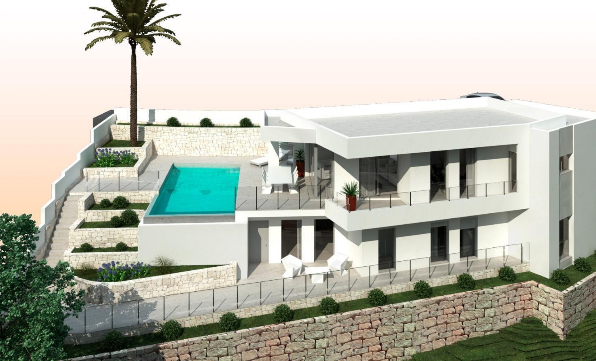 Modern villa under construction in a quiet green area of Moraira, with open views of the mountains and vineyards. Completion planned for July 2025. The property is distributed over two levels. The upper level features a living room, kitchen, guest toilet, and access to large terraces with a chill-out area and infinity pool. The lower level consists of three bedrooms and two bathrooms. Equipped with modern finishes and integrated smart technology. The design emphasizes privacy, natural light, and seamless indoor-outdoor living. Located just a short drive from the town center, beaches, supermarkets, golf and tennis clubs, walking trails, and other amenities.