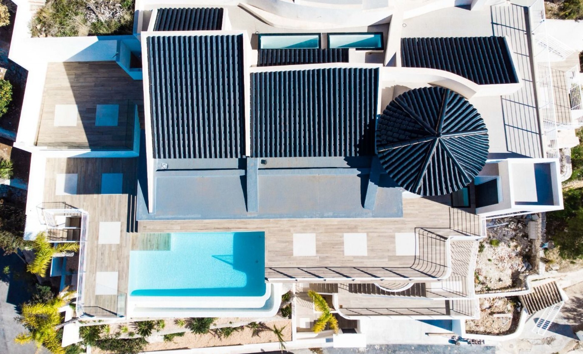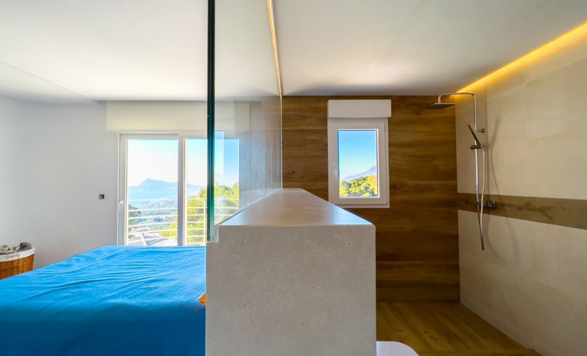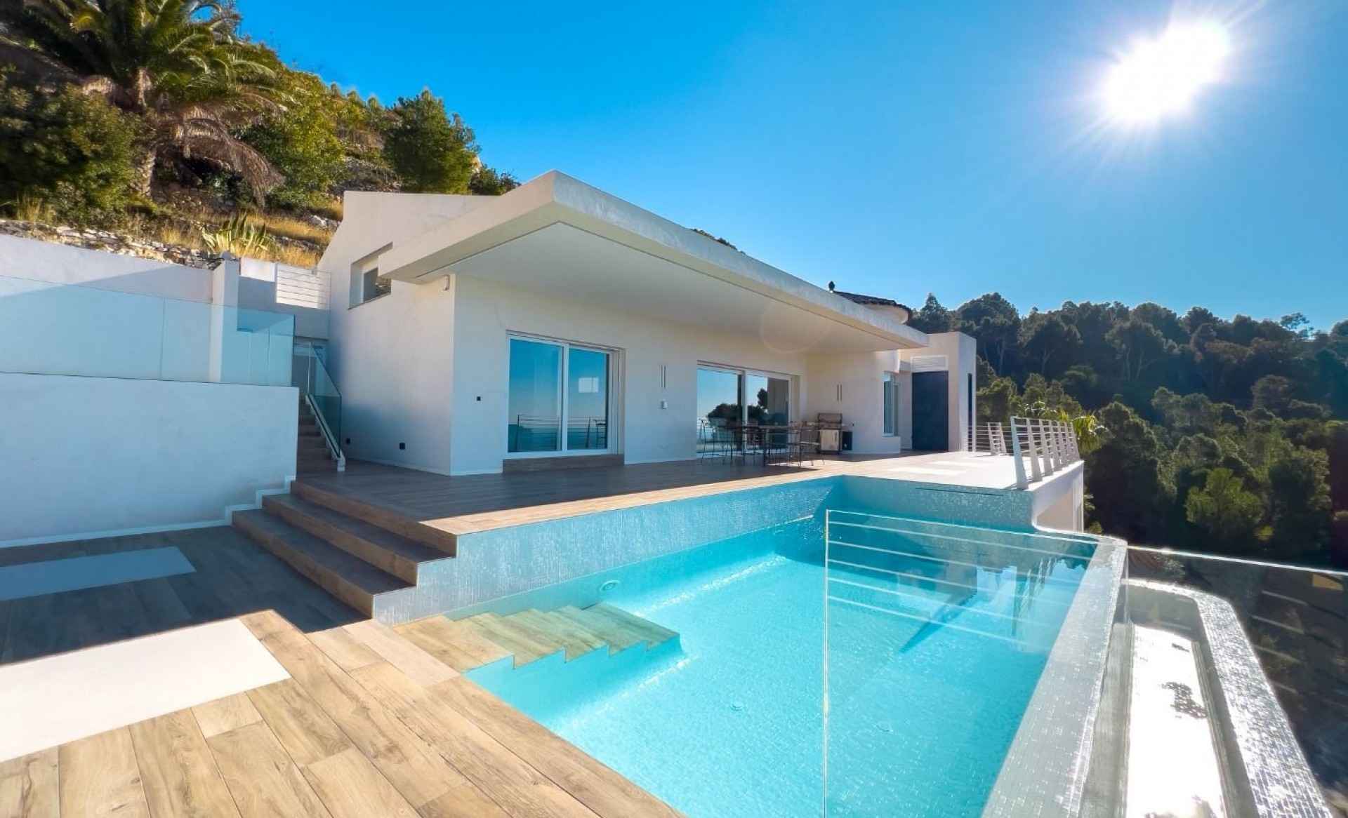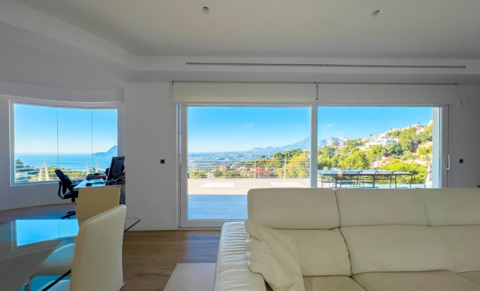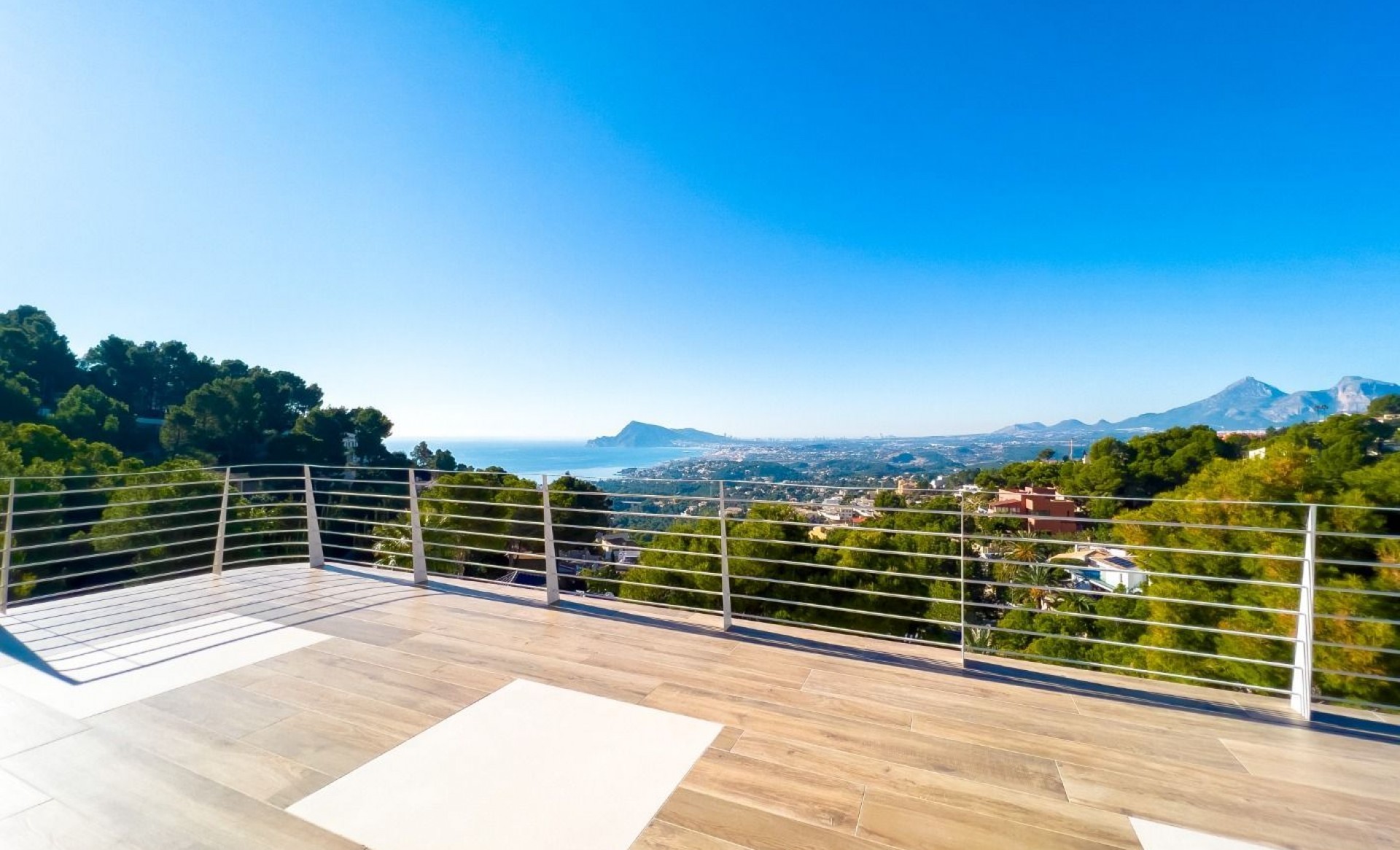 This stunning 4-story villa is designed to offer both luxury and tranquility, set in a serene and green area of Altea. With breathtaking views of the sea and mountains, this home combines elegant design with modern functionality. Ground Floor: Enter through a 6-meter-wide garage door, where you'll find have ample space to park several cars. In this area you have ample space aswell to have installed an elevator (as an extra) that would provide spectacular views through its panel window as it ascends through the villa. First Floor: This level offers 40 m² of versatile space, ideal for creating an independent apartment, a gym, or an additional suite. Second Floor: Features the main entrance hall, two full suites each with their own terrace, a guest restroom, and a laundry room. An indoor staircase leads to the next level. Third Floor: An expansive 80 m² open-plan space houses the designer kitchen by Porcelanosa, living room, and dining area. The living room opens directly onto the 150 m² main terrace and infinity pool, while the kitchen provides access to a separate terrace and a staircase leading to the rooftop solarium and additional plot space. This villa is equipped with underfloor heating and independent air conditioning systems for each room, powered by an efficient Daikin aerothermal system. A smart home KNX system by Jung allows you to control villa appliances remotely. The main terrace features a 25 m² BBQ area, an outdoor bathroom, and a pool shower, offering everything you need for outdoor living without the need to enter the house. The villa’s high-quality finishes include a state-of-the-art Porcelanosa ceramic floor that mimics colonial wood, extending throughout the entire property, both inside and out. Large-format ceramic tiles adorn the walls of the master bedroom and living room. This exceptional villa is waiting for you to make it your own. For more information or to schedule a viewing, please contact us.