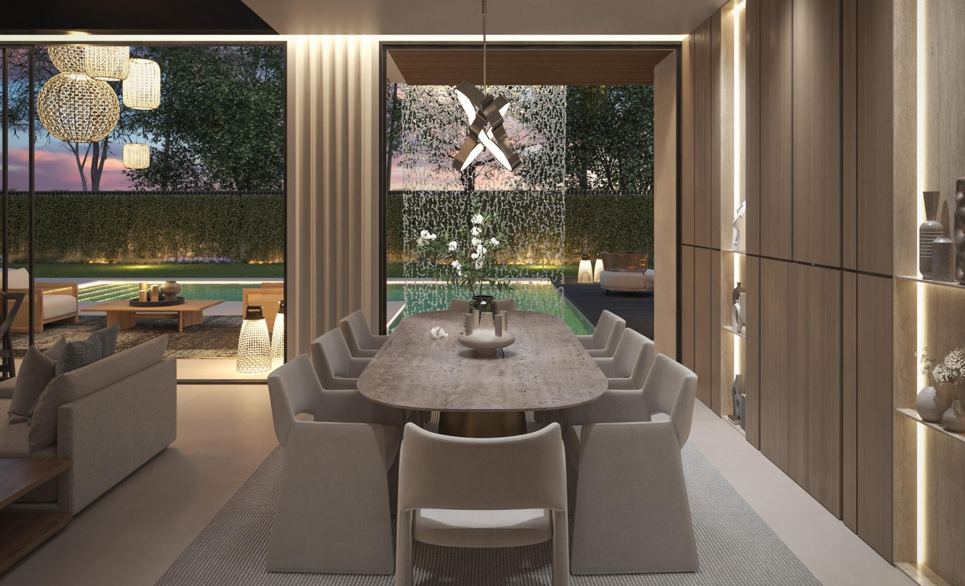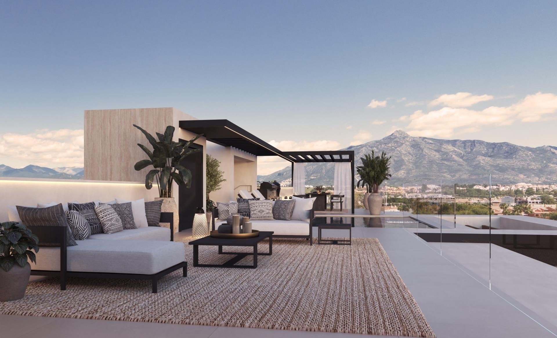 NEW BUILD VILLAS IN MARBELLA New Build development of Villas in Marbella, located in a unique and privileged environment, where, within walking distance walking distance to, among other things, the sea with its promenade and its different promenade and its different gastronomic offers, San Pedro de Alcántaracentre, as well as the famous Puerto Banús. It is made up of 7 exclusive Villas organised in a gated residential complex gated residential complex, with a very careful architectural design and excellent services. Its architecture responds to contemporary criteria based on classic lines of great elegance, integrated into its surroundings, with a combination of materials and combination of materials and finishes that have been carefully studied for each area or room of the house. WARDROBES AND DRESSING ROOMS- In master bedroom, dressing room with LED lighting and functional distribution with drawer units and glass shelves.- In bedrooms 2, 3 and 4, DICA wardrobes and functional distribution with shelves, drawer units and doors.- In the entrance hall with shelves, drawer units and doors. BULTHAUP Kitchen, a company specialised in applying genuine materials of the highest quality to its kitchen systems, chosen for their suitability for use, durability and authenticity, without forgetting ecology and harmony between materials and colours.The kitchen is completed with SIEMENS STUDIOLINE appliances, high-performance appliances with a modern design that offer a 10-year guarantee on all of them. VIDEO DOOR ENTRY SYSTEM. ACCESS CONTROL SYSTEM.- Communal video door entry module at the entrance gate to the street.- Individual modular outdoor IP video door entry module with 1 call button in each home.- Indoor IP console with touch screen for IP Wifi video door entry systems. AIR CONDITIONING, HEATING AND VENTILATION- Throughout the house air conditioning with heat pump system and ducts, independent control per room, AIRZONE type integrated in the home automation system. The distribution in the main rooms is carried out by means of linear diffusers integrated into the architecture of the house and grilles, depending on the rooms.- Underfloor heating on the ground floor and first floor, by aerothermal system, except in all bathrooms, where the underfloor heating will be electric.Control system integrated in the home automation system with independent thermostats by zones.- Mechanical ventilation with a system of ducts and extractors that ensures optimum indoor air quality in compliance with the Technical Building Code DB-HS3. LIFT- Lift with 3 stops for 4 people and capacity for the disabled, from the basement to the first floor. ELECTRIC VEHICLE CHARGING POINTS- Electric vehicle charging point in the parking area. HOME AUTOMATION SYSTEM (CONTROL SYSTEM)- Domotic control system designed by ILLUSION with LUTRON equipment to control air conditioning/heating, sound and lighting. GARDENS AND IRRIGATION- Landscaping according to landscaping project and existing trees.- Automatic irrigation system by zones with sprinklers on lawns and drip irrigation in landscaped areas. 3,000 litre water tank. POOL- Swimming pool of approximately 55m2, connecting the house with the garden, in an L-shape up to the balcony of the dining room and with two different depths, for swimming and relaxing. Crossed by the path of garden steps to connect it with the Pool Bar, it has a waterfall from the first floor terrace forming a curtain of water between the pool and the dining room.- DECK-type areas at one end of the pool for sunbeds or other furniture. SECURITY SYSTEM- Comprehensive security project for the entire development.- The homes will be equipped with a bidirectional microprocessed alarm centre with total or partial programming, alarm reception centre, GPRS and IP module. Presence sensors in all rooms and siren.- The arming and disarming of the alarm will be integrated in the home automation system and can be operated from the keypad in the home or the App.- The alarm system is also equipped with a flood sensor in the installation rooms.- A CCTV system will be installed around the perimeter of the development and at the entrances to the communal road with SONY 7/3' CCD colour cameras with high power IR Leds, connected to a digital recorder. OPTIONAL SOLARIUM- Access to the solarium by means of the complete staircase and lift, being integrated as another floor of the house.- The last flight of stairs will be open to the exterior by means of large openings in the façade enclosure.- Glass railings on the front of the terrace leaving the views of the garden area free.- Pergolas on the roof at the lift landing and stairs, and in the kitchen/barbecue area.- Installations for outdoor kitchen and/or barbecue, lighting and power sockets.- In-ground swimming pool with perimeter bench overlooking the garden of approximately 16m2.- Entertainment area for sunbeds or terrace furniture overlooking the garden.