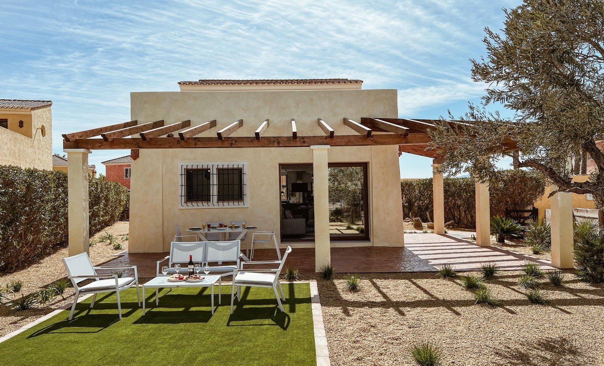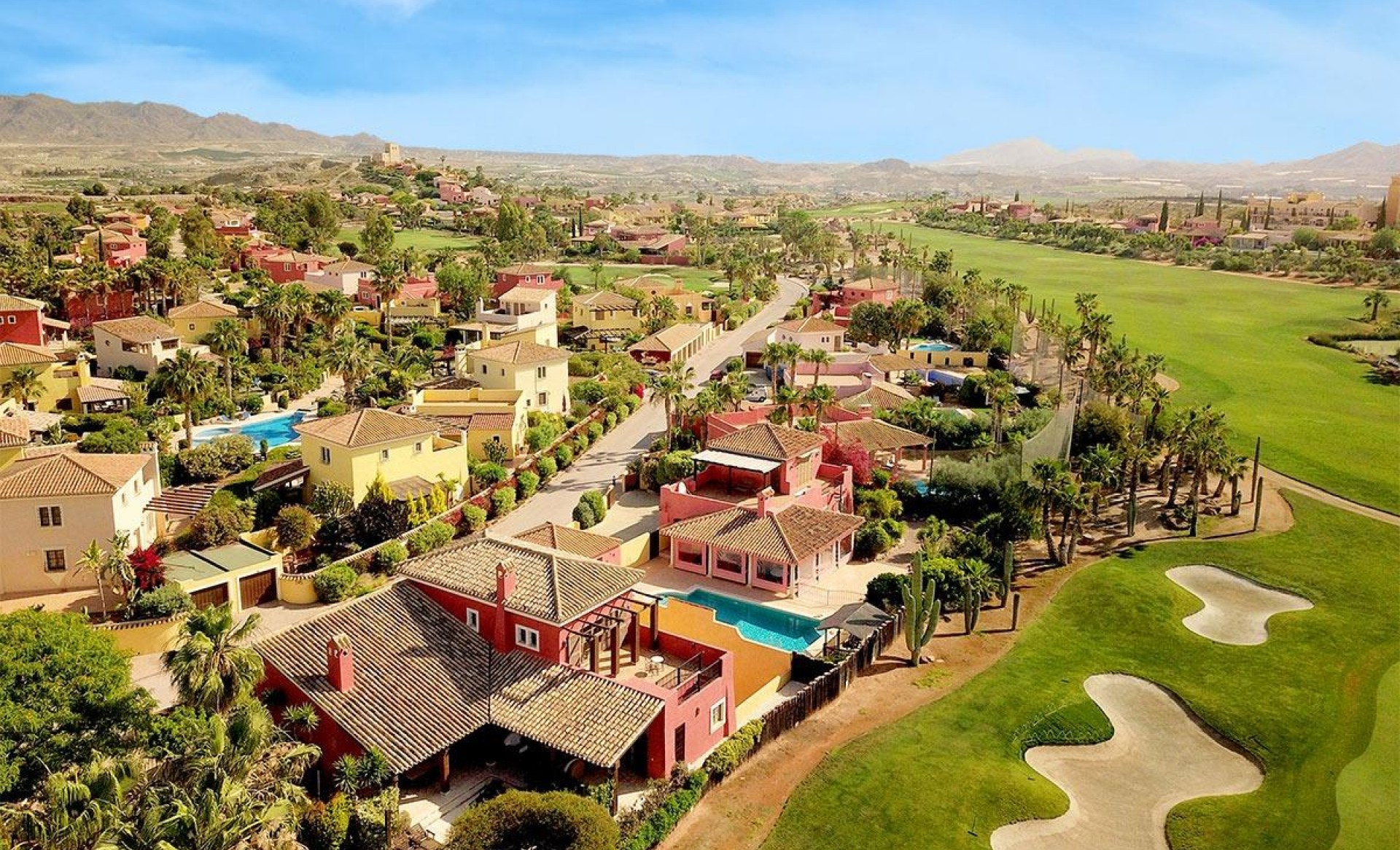 This delightful 3 bedrooms villa is located within the quiet area of golf course, providing stunning views across the Championship golf course and mountain ranges beyond. The villa has large terraces and pergolas, whilst the interior offers a stylish contemporary home with modern appeal. Features include the main bedroom, located on the first floor, leading out to a large open terrace, fully landscaped garden, ample terracing for alfresco dining, Air conditioning, double glazing, high quality fitted kitchen, white goods and bedroom wardrobes, and security fittings are standard throughout. Allocated underground parking. Built in an intimate and secure enclave, the villa shares beautiful individually landscaped communal gardens and swimming pools, with all the cost benefits implied. Villas located within Europes only International Award-Winning Family Resort and Championship Desert Golf Course. Desert Springs Resort is unique, situated in one of the most tranquil and sought-after enclaves on the Andalucía coast in Cuevas del Almanzora and Vera in Almería, providing Spain’s finest selection of affordable luxury property, from apartments to townhouses and villas of all sizes, all built to our demanding specification. It is an award-winning golf, sports & leisure retreat set amongst rocky outcrops and emerald green fairways, nestled within a luxury estate. The resort is surrounded by undisturbed nature and boasts spectacular views of landmark mountain ranges and the Mediterranean.