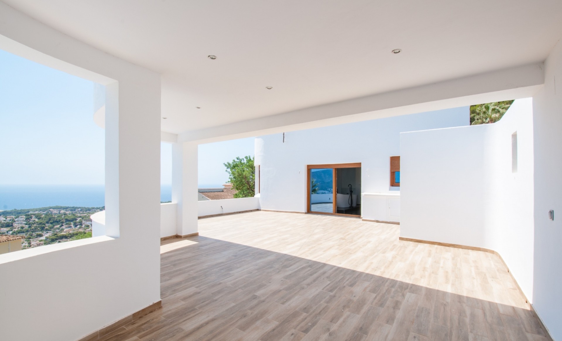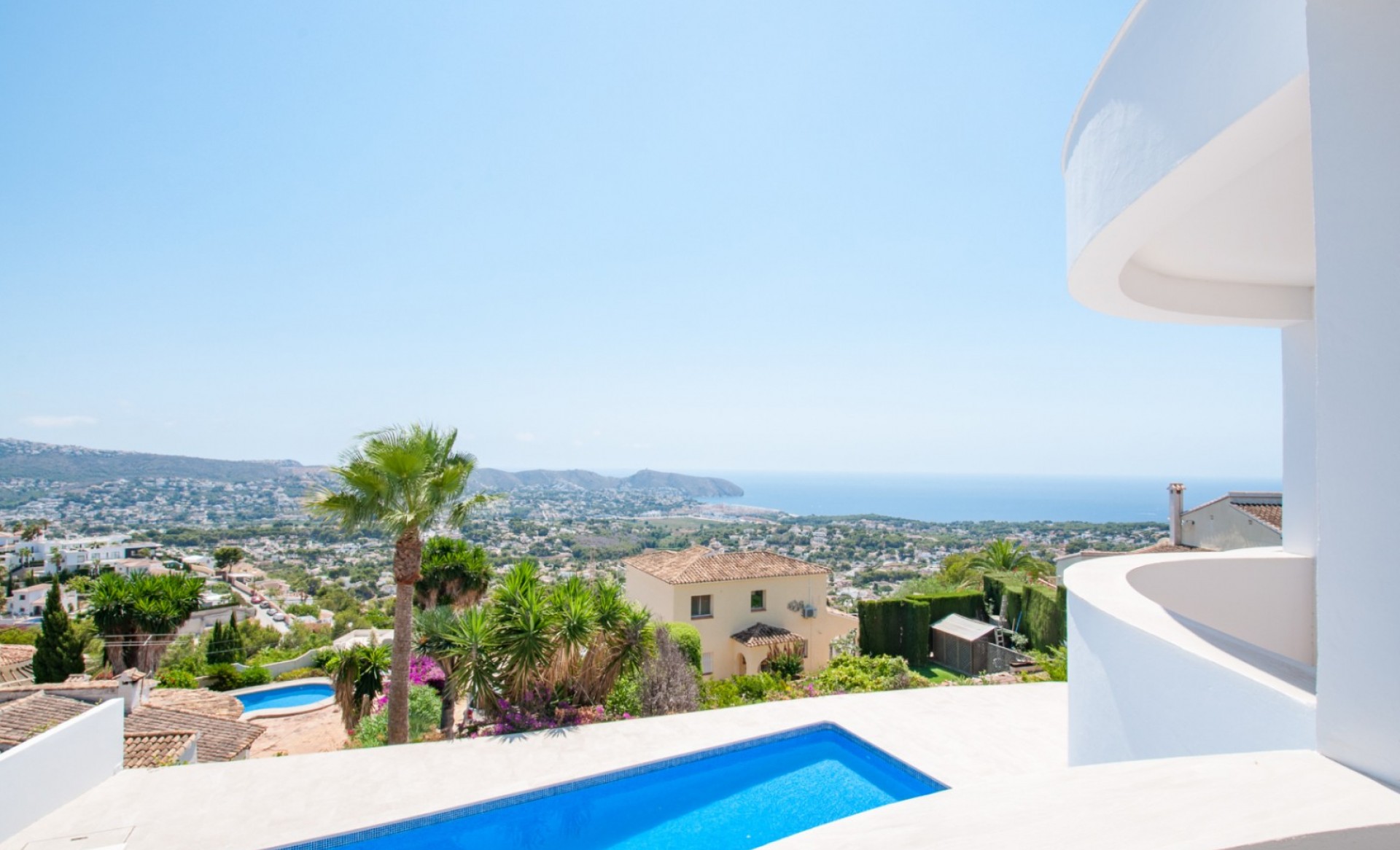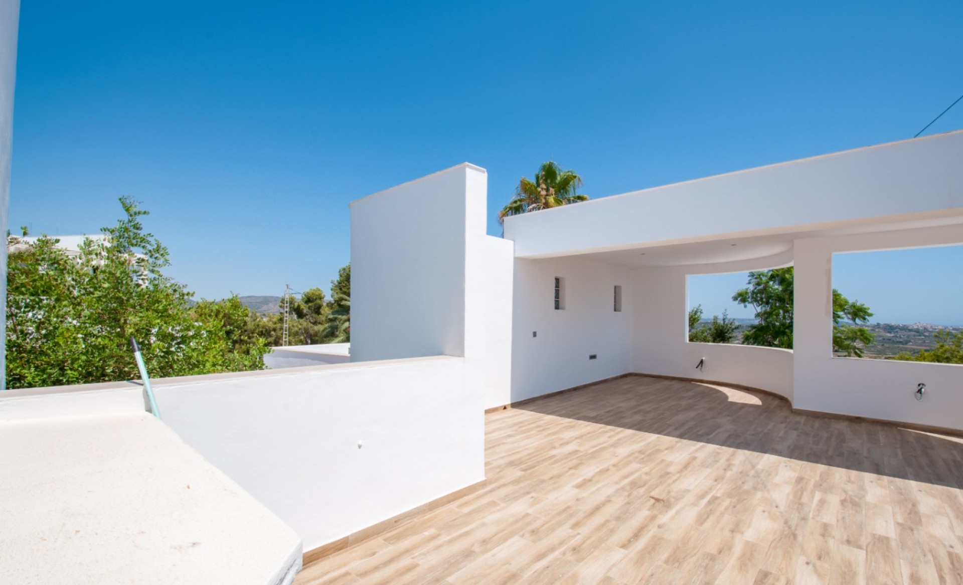 Modern villa with spectacular sea views for sale in Moraira. South-facing and built on a large plot, the property offers 394 m² of constructed area over two levels. The upper floor is exclusively dedicated to the master suite with en-suite bathroom, walk-in wardrobe, and access to a private covered terrace. The ground floor includes a spacious living-dining area, four additional bedrooms, and three bathrooms (two en-suite). One of these rooms also features a walk-in closet. The villa comes with underfloor heating (hot/cold), pre-installed A/C, alarm system, automatic shutters, electric gate, a private pool (approx. 4.5 x 9 m) with cover, outdoor kitchen and shower, garage, two parking spaces, and a large storage room. Kitchen installation to be completed by the buyer.