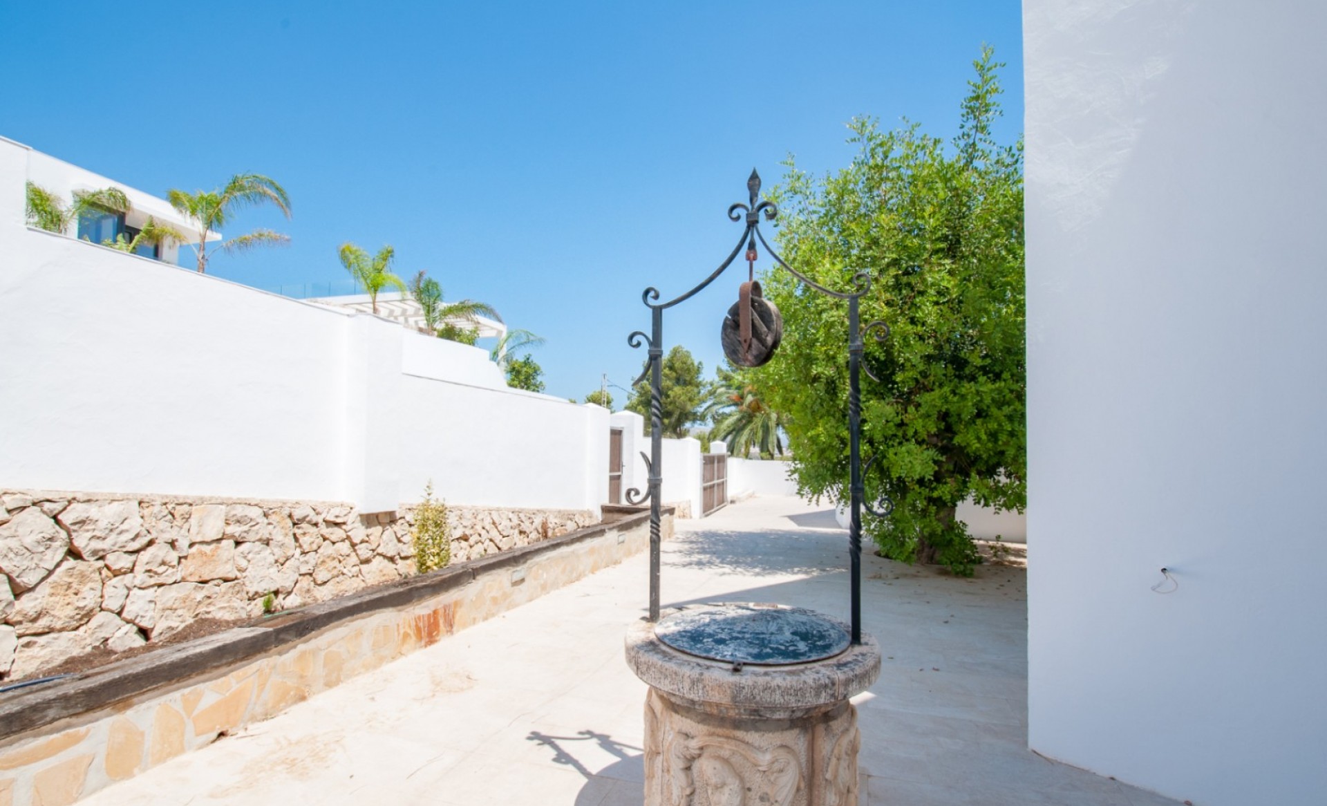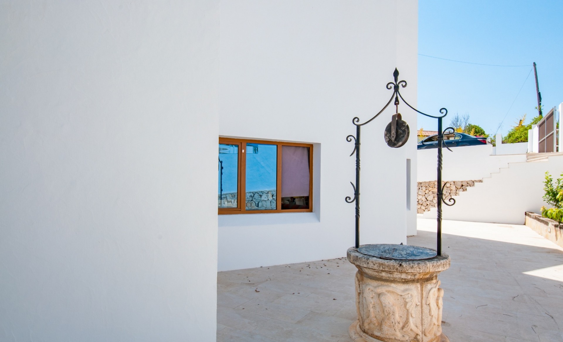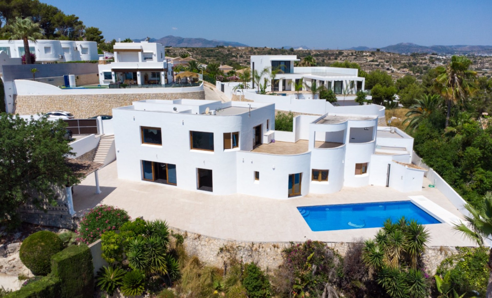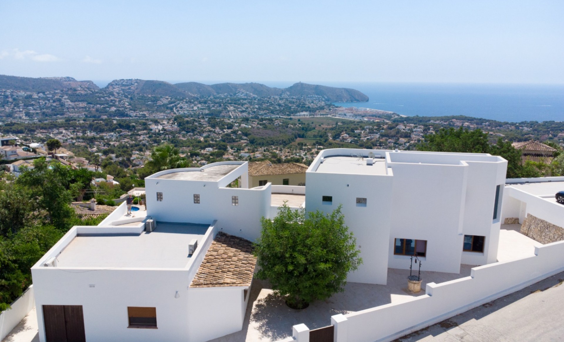 Modern villa with spectacular sea views for sale in Moraira. South-facing and built on a large plot, the property offers 394 m² of constructed area over two levels. The upper floor is exclusively dedicated to the master suite with en-suite bathroom, walk-in wardrobe, and access to a private covered terrace. The ground floor includes a spacious living-dining area, four additional bedrooms, and three bathrooms (two en-suite). One of these rooms also features a walk-in closet. The villa comes with underfloor heating (hot/cold), pre-installed A/C, alarm system, automatic shutters, electric gate, a private pool (approx. 4.5 x 9 m) with cover, outdoor kitchen and shower, garage, two parking spaces, and a large storage room. Kitchen installation to be completed by the buyer.
