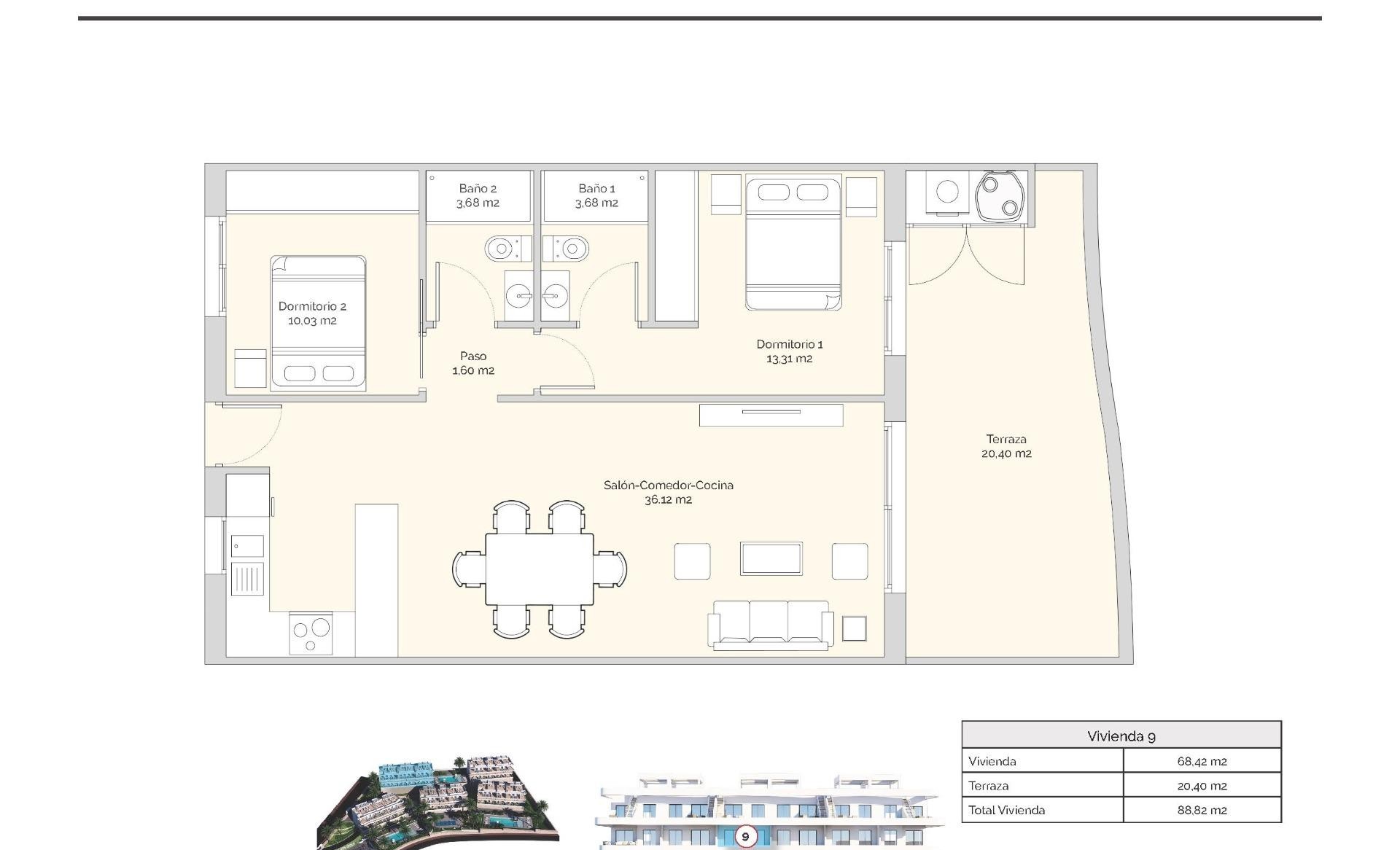 New Build residential complex in Balcon de Finestrat. This complex of modern apartments with 2 bedrooms, 2 bathrooms, open plan kitchen with the living area. Some of the apartments will have sea views. Ground floor apartment with a private gardens, middle floor apartments with the terraces and top floor apartments has a terraces and private solariums. Each property has private underground parking space. The properties have access to the communal area with 3 swimming pools, parking, paddle, playground, calisthenics. It is a great opportunity and privilege to be able to live with this environment of golf and beach, close to all amenities of all services considered one of the best places to invest. Finestrat located in the Marina Baixa region of the Costa Blanca.Benidorm is just a five-minute drive from the properties and offers all the services you would need including shops, bars, restaurants, supermarkets, banks, pharmacies and several private international schools. Close to the beaches of Levante, Poniente and Cala de Finestrat, with more than 6km in length that are among the best in Europe awarded by the European Union with Blue Flags. All leisure services such as the theme parks of Aqua Natura, Terra Mítica, Terra Natura, Aqualandia and Mundomar, Sierra Cortina and Villaitana Golf courses, hiking and climbing in Puig Campana an incomparable natural setting or enjoy of nautical sports. Distance to the sea 4 km, to the airport 26 km and to the golf 1km.