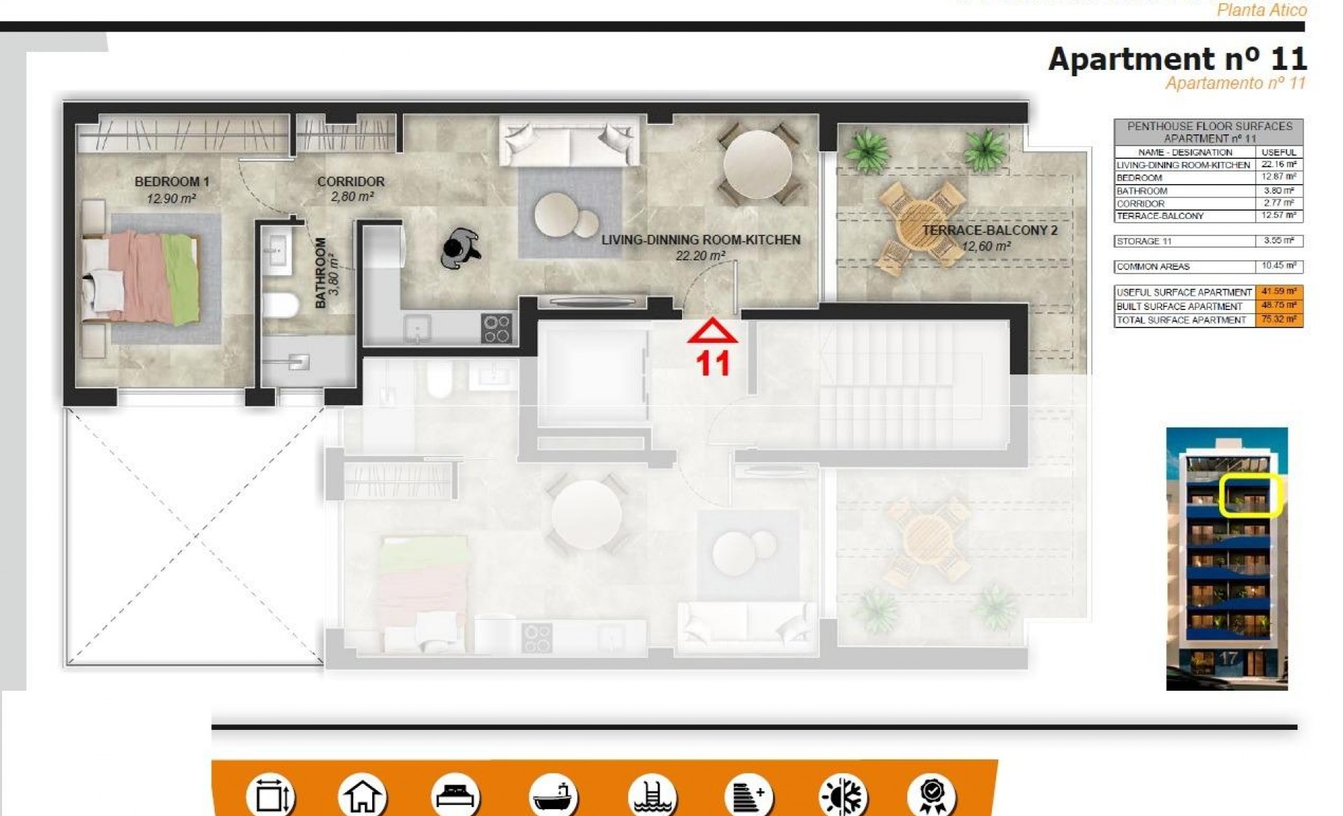 Logements modernes dans un emplacement privilégiéDécouvrez cette nouvelle promotion au cœur de Torrevieja, à seulement 200 mètres de la plage de l'Acequión, l'une des plus populaires de la ville. Cet immeuble résidentiel comprend 11 logements répartis dans un environnement calme, idéal pour ceux qui souhaitent vivre près de la mer sans renoncer aux services urbains. L'emplacement offre un accès à pied au centre de Torrevieja, aux parcs, aux restaurants, aux supermarchés et à tous les services nécessaires à la vie quotidienne. Distances aux points clés : Plage de l'Acequión : 0,2 kmCentre de Torrevieja : 0,7 kmPort de plaisance Marina Salinas : 1,5 kmHôpital universitaire de Torrevieja : 5,5 kmCamp de golf Villamartín : 10 kmCentre commercial Habaneras : 3 kmAéroport d'Alicante : 45 km Différents types de logements pour tous les besoinsLe bâtiment propose une sélection de studios, d'appartements de 1 et 2 chambres et d'appartements-terrasses avec de grandes terrasses privées. Tous les logements disposent d'un débarras au rez-de-chaussée et d'un accès à des installations communes modernes qui améliorent le niveau de confort et le style de vie. Espaces communs pour le bien-être et le plaisirLe toit-terrasse du bâtiment a été conçu comme un espace commun haut de gamme avec :PiscineSolariumSaunaEspace barbecueIdéal pour profiter du climat méditerranéen de Torrevieja tout au long de l'année. Des prestations haut de gamme dans chaque logementLes logements ont été construits avec des matériaux de première qualité et un design contemporain : Menuiserie extérieure en PVC avec double vitrage Guardian SunVolets roulants motorisés avec isolation thermiquePorte d'entrée blindée avec serrure de sécuritéCuisine équipée avec meubles hauts et bas et appareils électroménagers intégrés : plaque vitrocéramique, four, micro-ondes, hotte aspirante et lave-vaisselleProduction d'eau chaude par système aérothermiqueClimatisation entièrement installéeÉclairage LEDAscenseur dans le bâtiment Vivez à deux pas de la mer et du centre-villeTorrevieja est l'une des villes côtières les plus dynamiques et en pleine croissance de la Costa Blanca, célèbre pour son climat, ses plages, ses salines et sa vie culturelle. Cette promotion est idéale comme résidence principale, investissement ou résidence secondaire pour les vacances. Contactez-nous dès aujourd'hui pour plus d'informations ou pour organiser une visite et assurez-vous votre maison en bord de mer à Torrevieja.