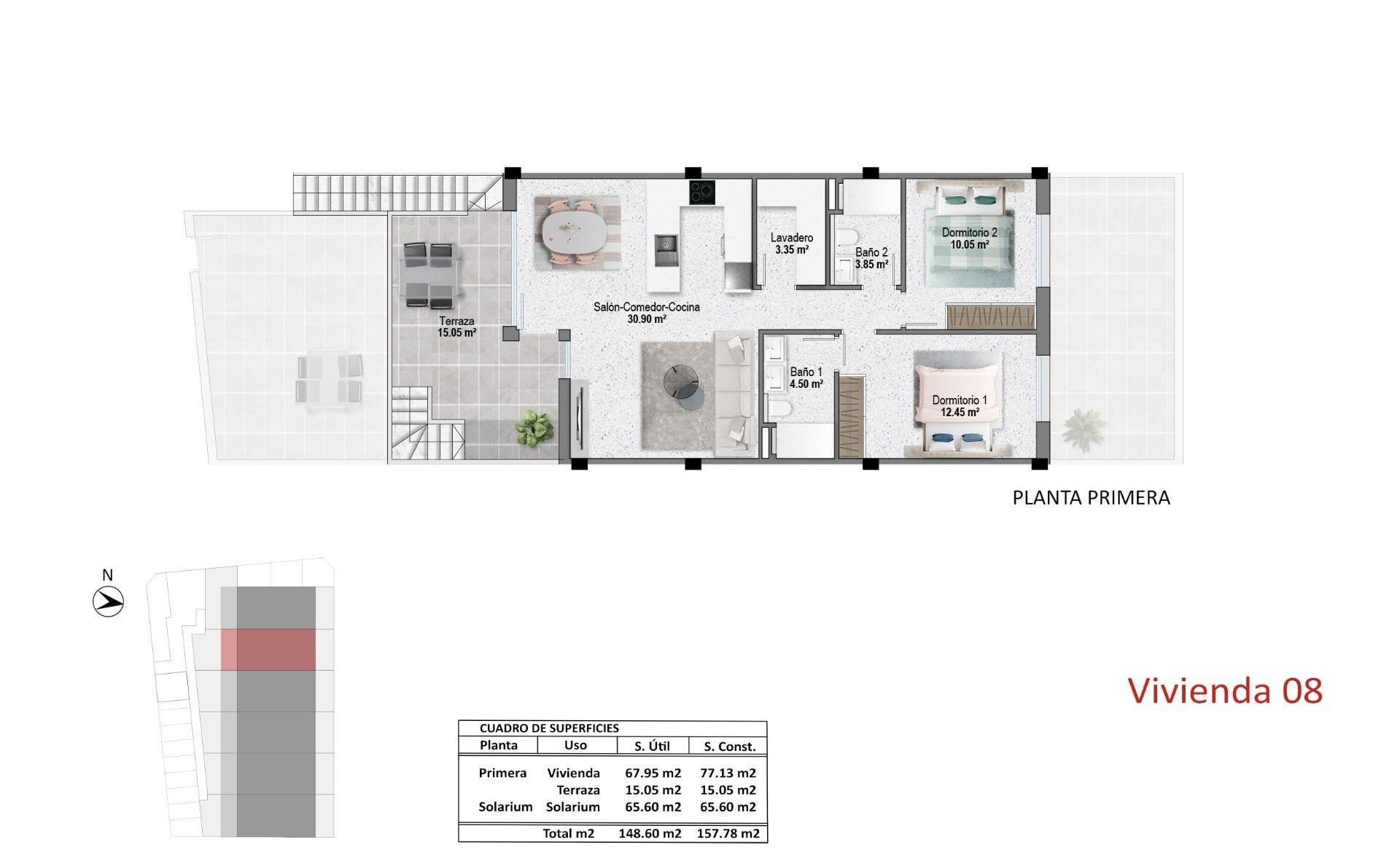 Une vie contemporaine au cœur de la Costa BlancaBienvenue dans un complexe résidentiel de 12 bungalows neufs situé à Pilar de la Horadada, une ville côtière animée à l'extrémité sud de la Costa Blanca. Cet emplacement privilégié offre le mélange parfait entre la tranquillité de la vie méditerranéenne et la commodité, avec tous les services essentiels, magasins, restaurants et commodités accessibles à pied. Les magnifiques plages de sable de Torre de la Horadada et Mil Palmeras sont à seulement 3 km, idéales pour des journées de détente à la plage ou pour pratiquer des sports nautiques. Choix de bungalows au rez-de-chaussée ou au dernier étageCe développement exclusif propose deux types de maisons modernes adaptées à votre style de vie : Des bungalows au rez-de-chaussée avec 3 chambres, 2 salles de bains et de grandes terrasses privées à l'avant et à l'arrière avec accès direct à la piscine et aux jardins communs.Les bungalows du dernier étage disposent de 2 chambres, de 2 salles de bain et d'un vaste solarium privé sur le toit, avec une cuisine d'été, une pergola et des toilettes pour invités. Toutes les maisons disposent d'espaces de vie lumineux et ouverts, de cuisines entièrement équipées, de la climatisation par conduits et d'un parking privé. Les chambres sont équipées d'armoires encastrées et les salles de bains bénéficient d'un chauffage par le sol pour plus de confort. Des équipements haut de gamme pour une vie méditerranéenne moderneLes maisons sont conçues avec des finitions de haute qualité et des caractéristiques pratiques, notamment : Porte d'entrée blindée avec finition en aluminiumVolets électriques dans le salon et les chambresSystème d'eau chaude aérothermiqueAppareils de cuisine BALAY ou équivalentSolariums sur le toit avec gazon artificiel, douche extérieure, éclairage et cuisine d'été complète avec lave-vaisselle, petit réfrigérateur, plaque à induction et hotte aspirante. Emplacement stratégique avec une excellente connectivitéPilar de la Horadada est bien relié aux principaux points d'intérêt de la Costa Blanca et de la Costa Cálida : Plages (Torre de la Horadada / Mil Palmeras) - 3 kmParcours de golf Lo Romero - 6 kmAéroport de Corvera (Murcie) - 40 kmAéroport d'Alicante - 55 kmCentre commercial Zenia Boulevard - 14 kmPort de plaisance de San Pedro del Pinatar – 11 km Votre maison idéale au soleilQue vous soyez à la recherche d'une escapade de vacances, d'une résidence à l'année ou d'un investissement locatif, ces bungalows à Pilar de la Horadada offrent un excellent rapport qualité-prix dans l'une des villes les plus prisées de la Costa Blanca. Contactez-nous dès aujourd'hui pour organiser une visite ou demander plus d'informations !