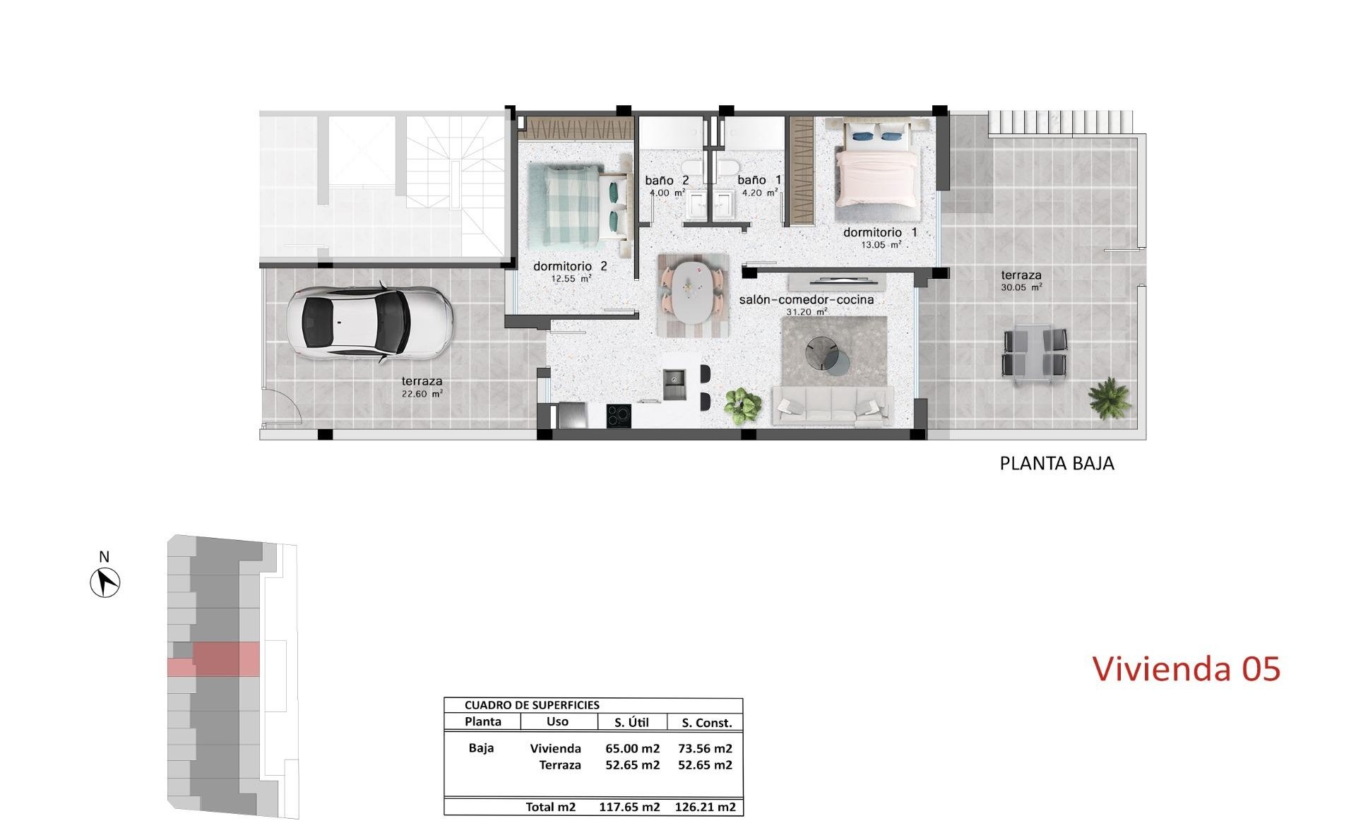 Bungalows modernes exclusifs à Pilar de la HoradadaCe nouveau projet propose 16 bungalows élégants dans la ville de Pilar de la Horadada, située dans la partie la plus méridionale de la Costa Blanca. Vous avez le choix entre des bungalows de 2 ou 3 chambres, chacun doté de 2 salles de bains. Les unités du rez-de-chaussée sont dotées de spacieuses terrasses à l'avant et à l'arrière, offrant un accès direct à la piscine et au jardin communs, tandis que les unités du dernier étage bénéficient d'un grand solarium privé sur le toit. Des espaces de vie spacieux et des équipements modernesChaque bungalow comprend un salon/salle à manger lumineux et ouvert et une cuisine entièrement équipée avec de grandes portes coulissantes qui relient les espaces intérieurs et extérieurs de manière transparente. Les chambres sont équipées d'armoires encastrées. La climatisation est installée et le complexe comprend un ascenseur pour faciliter l'accès aux étages supérieurs. Des places de parking privées sont également incluses pour toutes les unités. Situation privilégiée à Pilar de la HoradadaPilar de la Horadada est une ville espagnole traditionnelle avec une rue principale animée proposant des supermarchés, des boutiques, des restaurants et des bars. Les belles plages de Torre de la Horadada et de Mil Palmeras sont à seulement 5 minutes. Le développement est idéalement situé à 40 km de l'aéroport de Corvera (Murcie) et à 55 km de l'aéroport d'Alicante, ce qui en fait un endroit idéal pour une vie permanente ou des vacances.
