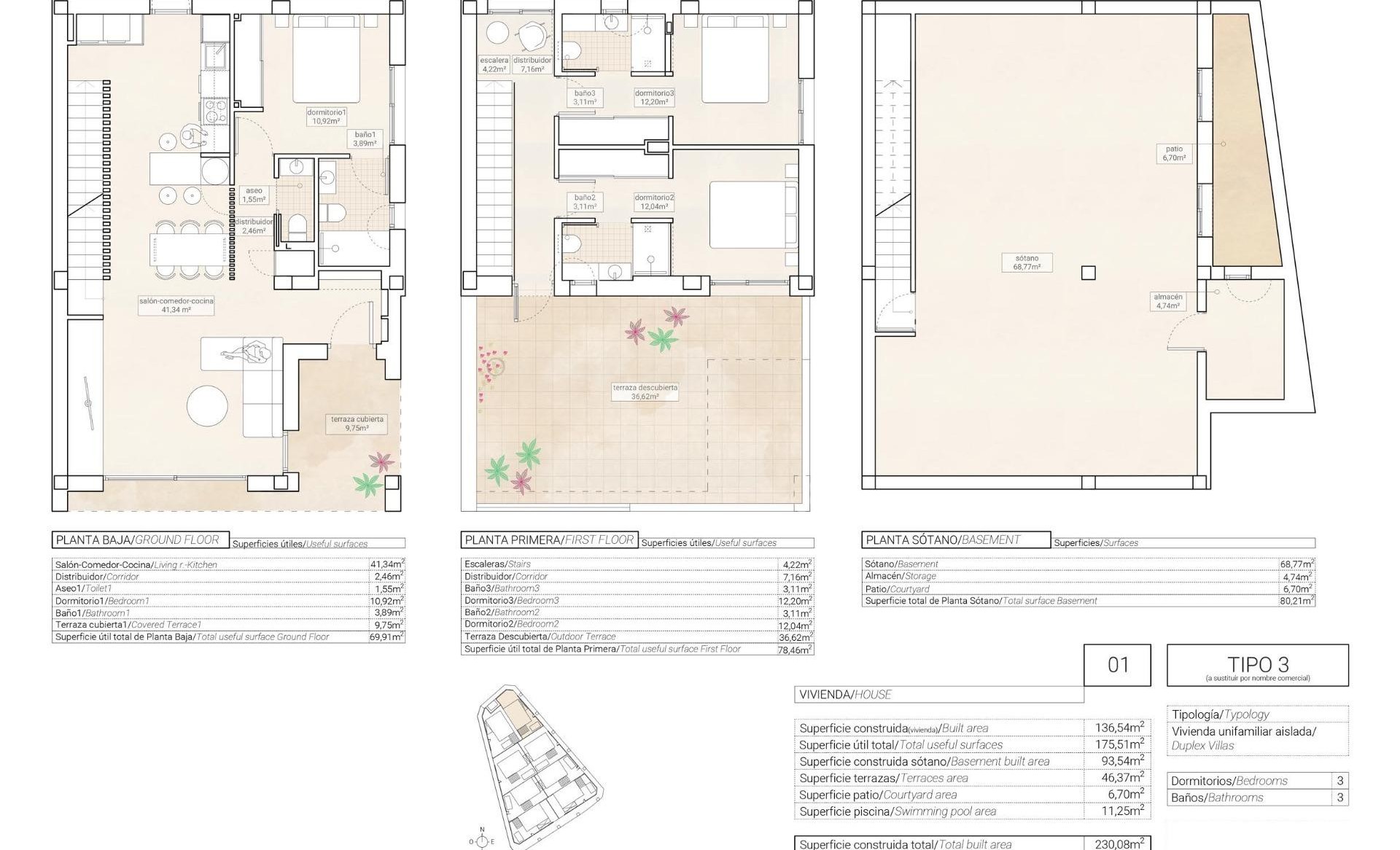 Villas modernes de construction neuve à Hondon de las Nieves. Villas composées de deux étages et d'un sous-sol avec cour anglaise, dispose de 3 chambres à coucher, 3 salles de bains, toilettes invités, cuisine ouverte sur le salon, armoires encastrées, terrasse et solarium privé. Les parcelles spacieuses disposent d'un jardin privé avec piscine, d'un espace barbecue et de la possibilité d'ajouter une place de parking. Hondón de las Nieves est une ville de la Communauté valencienne, en Espagne. Elle est située au sud-ouest de la province d'Alicante, dans la région du Vinalopó Medio. Les plages et l'aéroport d'Alicante se trouvent à 30 minutes en voiture.