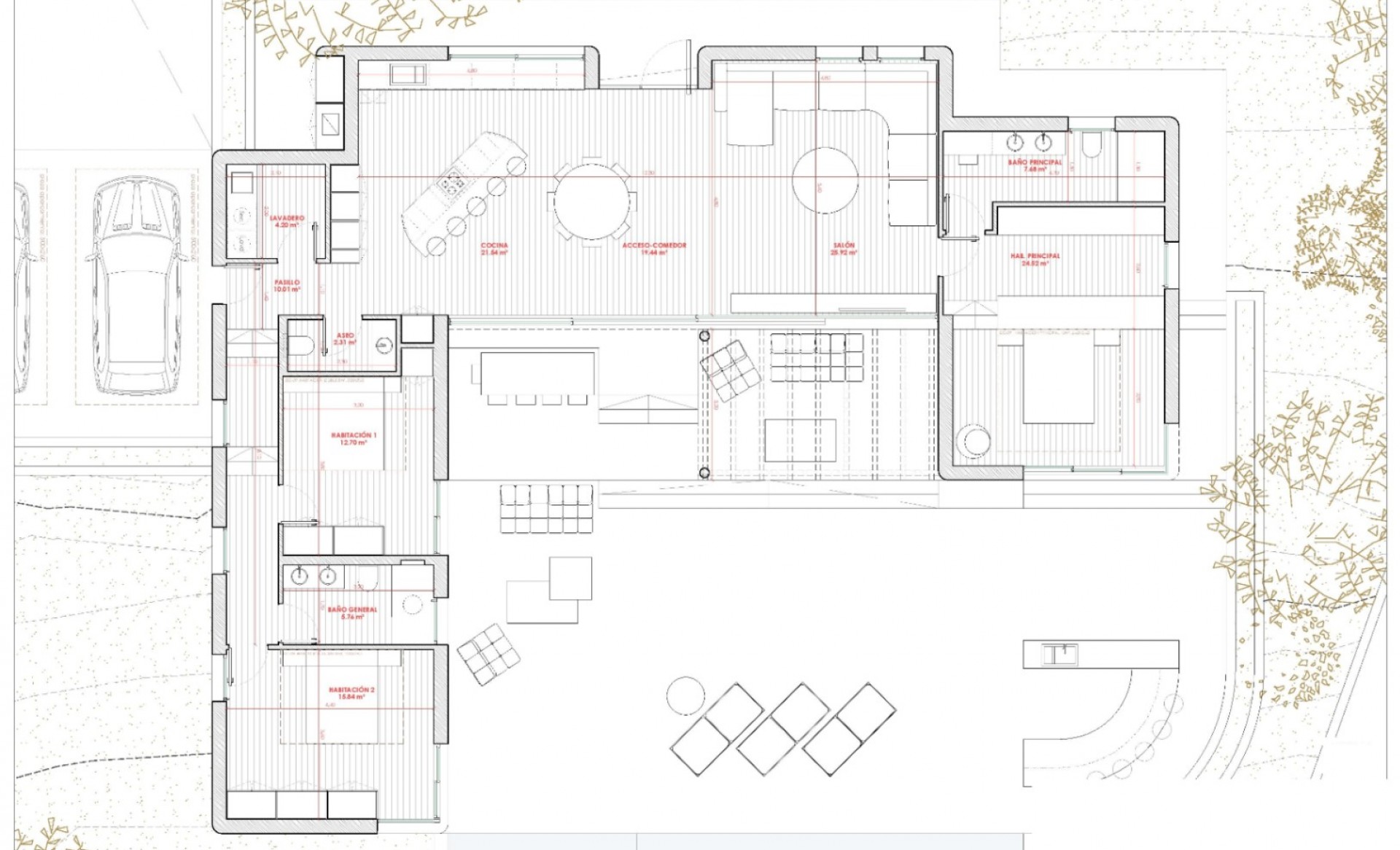 Villa moderne à Javea, construite en 2025 et située à 2 km du centre et de la plage. Orientation sud-est. La maison est distribuée sur un niveau et offre un salon, une salle à manger, une cuisine, des toilettes invités, trois chambres, deux salles de bains (dont une attenante) et une buanderie. Les caractéristiques extérieures comprennent des terrasses couvertes, une piscine privée, un bar, un abri de voiture et un espace de stationnement supplémentaire. Équipée de chauffage central, de climatisation et d'un portail électrique.
