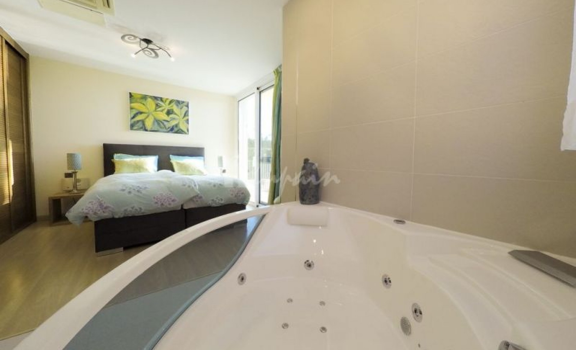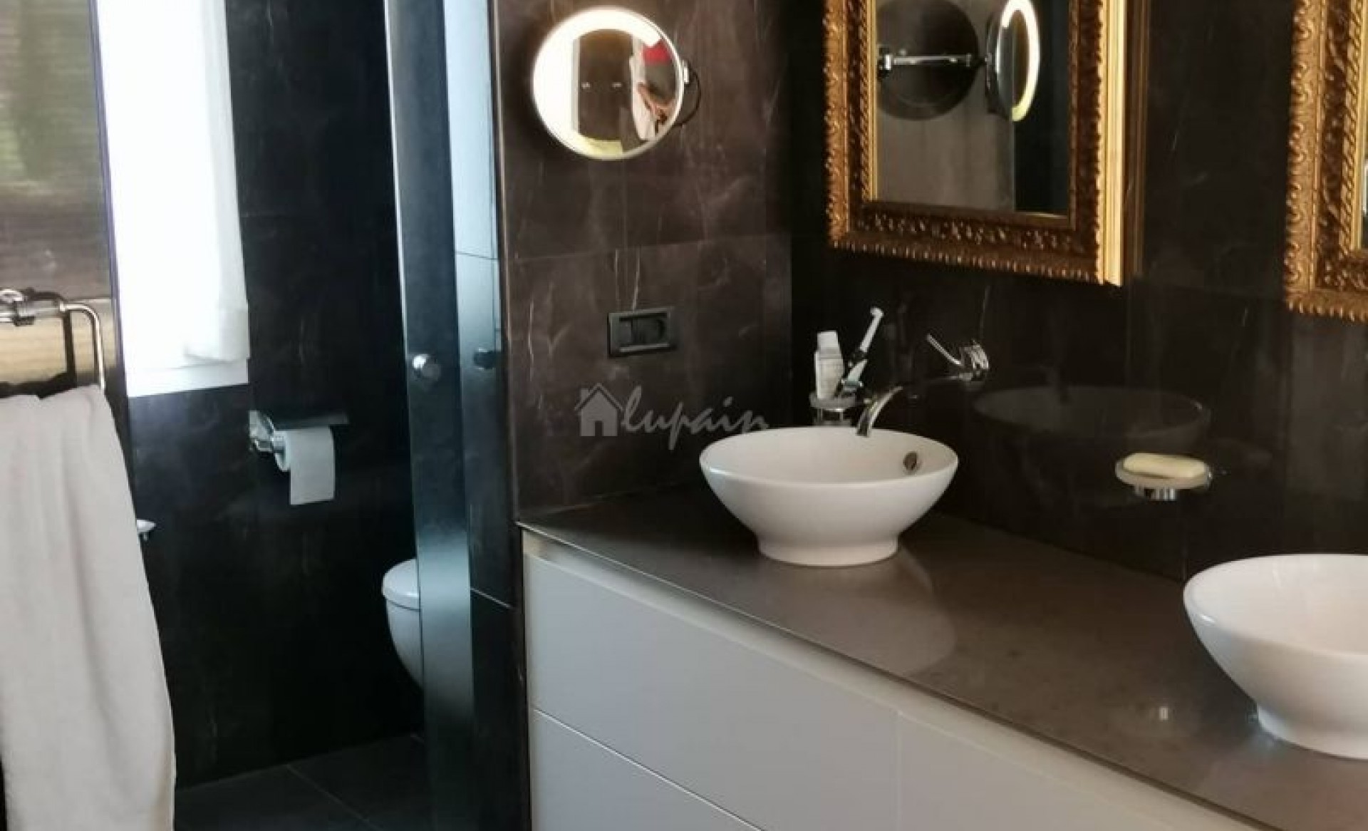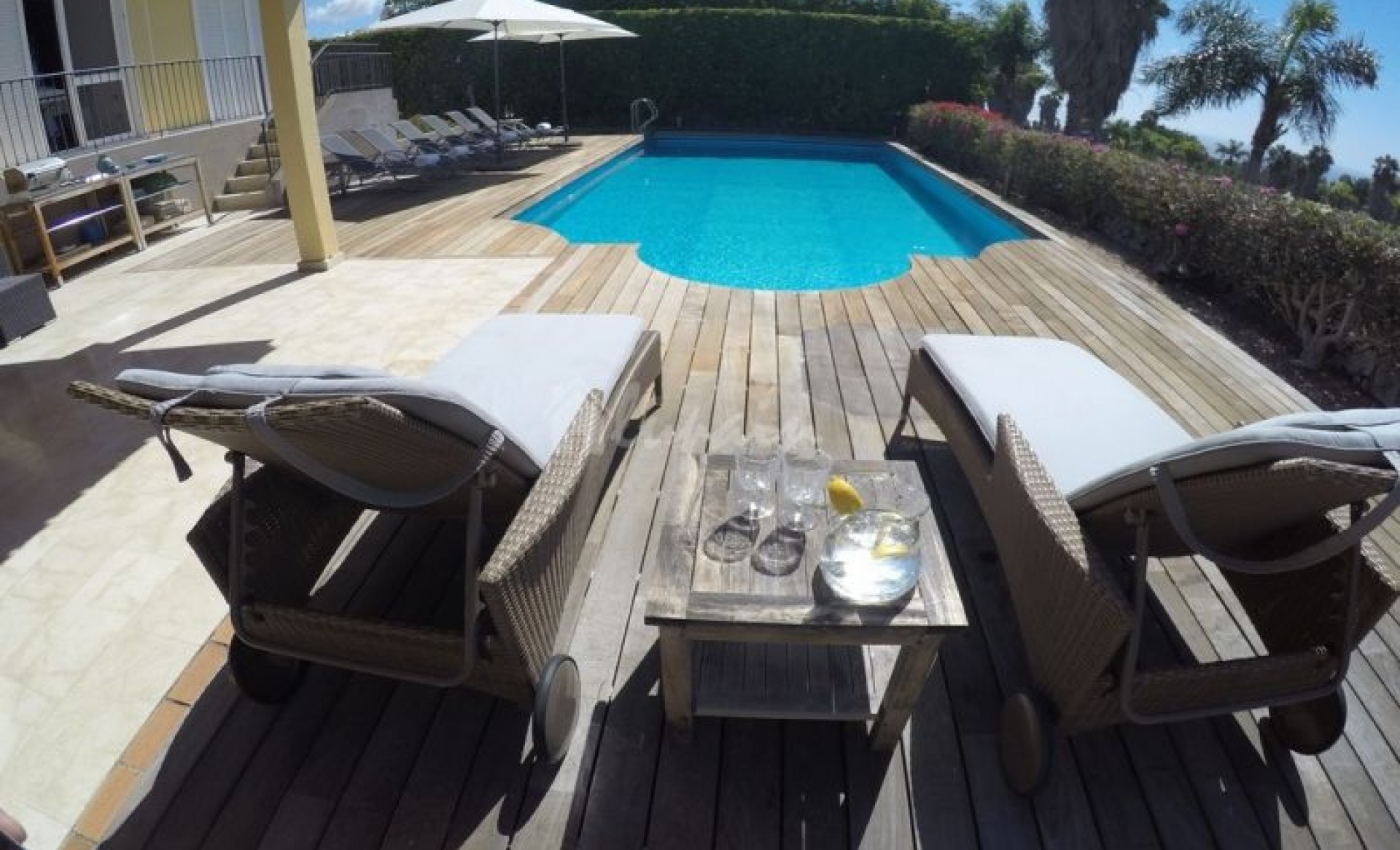 Prachtige villa met uitzicht op zee en de golfbaan, gelegen in een van de meest gewilde gebieden van Zuid-Tenerife. Deze stijlvolle woning ligt in een rustige straat op slechts 2 minuten van het charmante vissersdorpje La Caleta, bekend om zijn restaurants aan zee. Via de ruime hal of de ondergrondse garage bereikt u de begane grond van de villa. Hier bevindt zich een volledig uitgeruste keuken met aangrenzende wasruimte. Vanuit de keuken komt u in de eetkamer en woonkamer, met grote schuiframen die toegang geven tot het prachtige buitengedeelte. Met een ingebouwde barbecue, zwembad met buitendouche en ruime terrassen is dit de ideale plek om te ontspannen. Het uitzicht op de golfbaan en de oceaan is gegarandeerd en biedt volledige privacy. Deze verdieping heeft tevens drie slaapkamers met en-suite badkamers en een gastentoilet. Twee van de slaapkamers hebben directe toegang tot het zwembad. De master bedroom beschikt over een terras, badkamer met douche en een ruime inloopkast. Via een brede trap daalt u af naar een mezzanine waar zich de grote garage en technische ruimte bevinden. Verder beneden vindt u nog drie slaapkamers, twee badkamers, een gastentoilet en een multifunctionele ruimte. De golfbaan van Costa Adeje is internationaal bekend en ligt vlak bij de kust. De stranden en commerciële centra zijn slechts enkele minuten rijden.