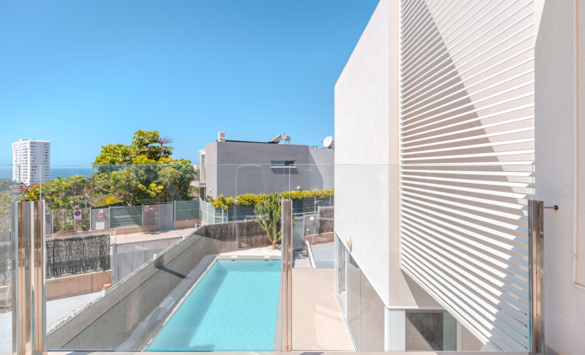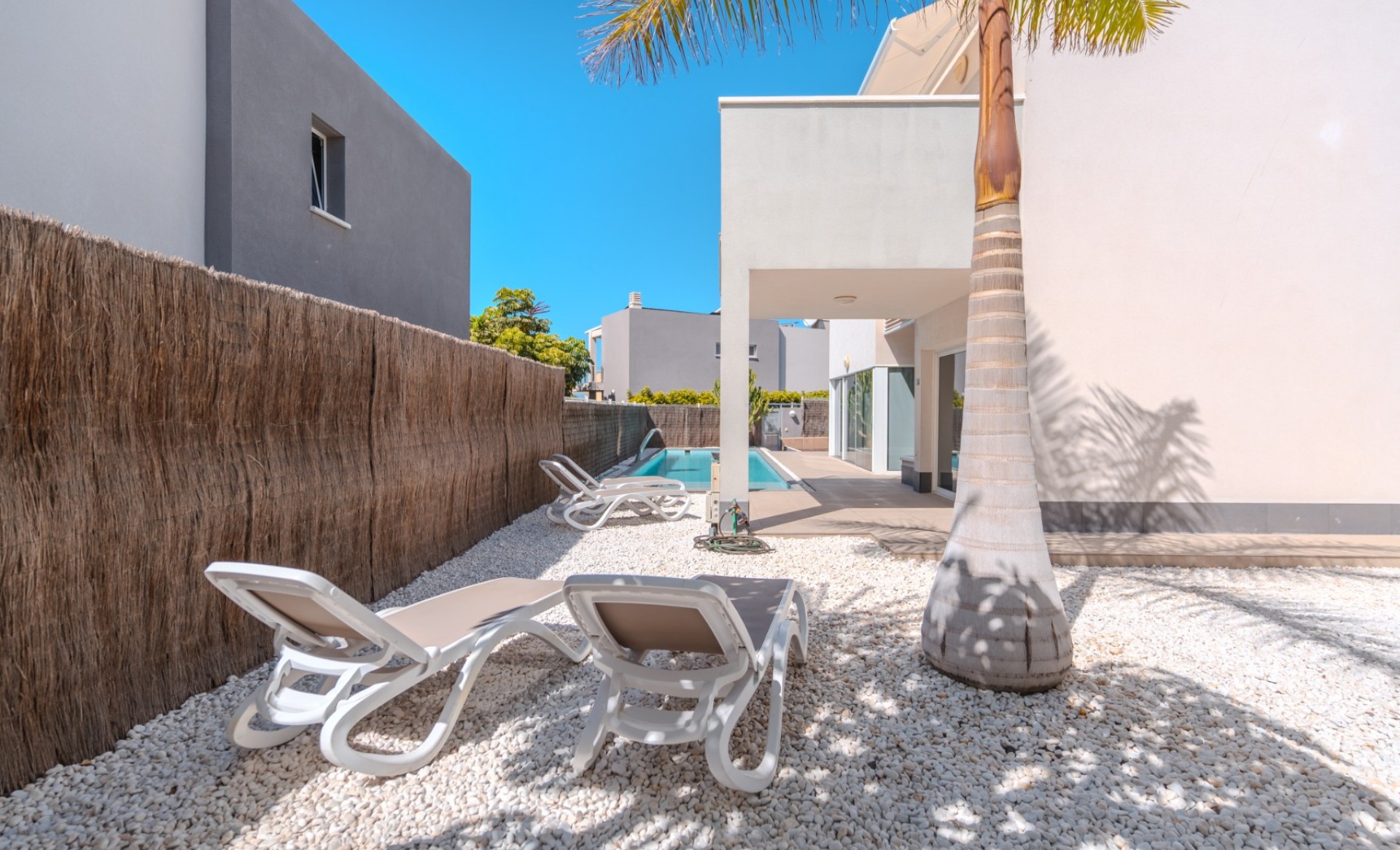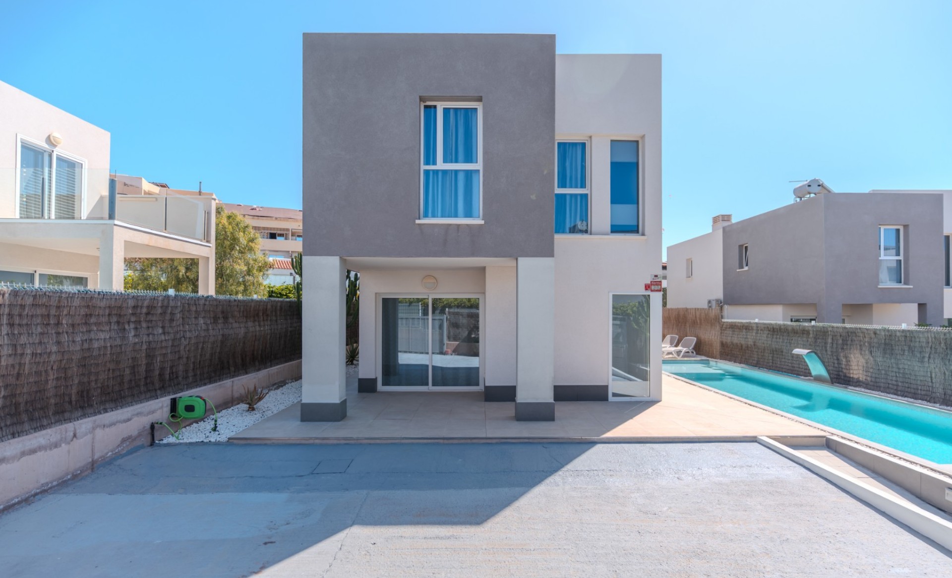 Gebouwd op een perceel van 386,85 m², biedt deze elegante villa een modern ontwerp met een bebouwde oppervlakte van 146,85 m², waarvan 104,22 m² bruikbaar woonoppervlak, verdeeld over twee verdiepingen. De begane grond (80,83 m²) beschikt over een ruime en lichte woonkamer met eetgedeelte, een volledig ingerichte keuken, een gastentoilet en een berging. De eerste verdieping (66,02 m²) heeft drie slaapkamers met inbouwkasten, twee badkamers (waarvan één en suite) en een extra berging. De hoofdslaapkamer opent naar een zonnig terras met een mooi zeezicht. De woning is uitgerust met airconditioning en zonnepanelen voor warm water, wat zorgt voor comfort en energie-efficiëntie het hele jaar door. Buiten is de villa omringd door terrassen en een tuin met een verwarmd zwembad. Aan de achterkant bevindt zich een extra berging en aan de voorkant is er ruimte om minimaal twee auto’s te parkeren. Gelegen in de exclusieve, afgesloten gemeenschap Nirvana Paraíso, direct tegenover het winkelcentrum Las Rosas, met winkels, bars en restaurants binnen handbereik. Het Las Galgas-strand en het Hard Rock Hotel liggen op slechts 10 minuten lopen. Een ideale woning om permanent in te wonen of als investering, aangezien deze beschikt over een vergunning voor toeristische verhuur.