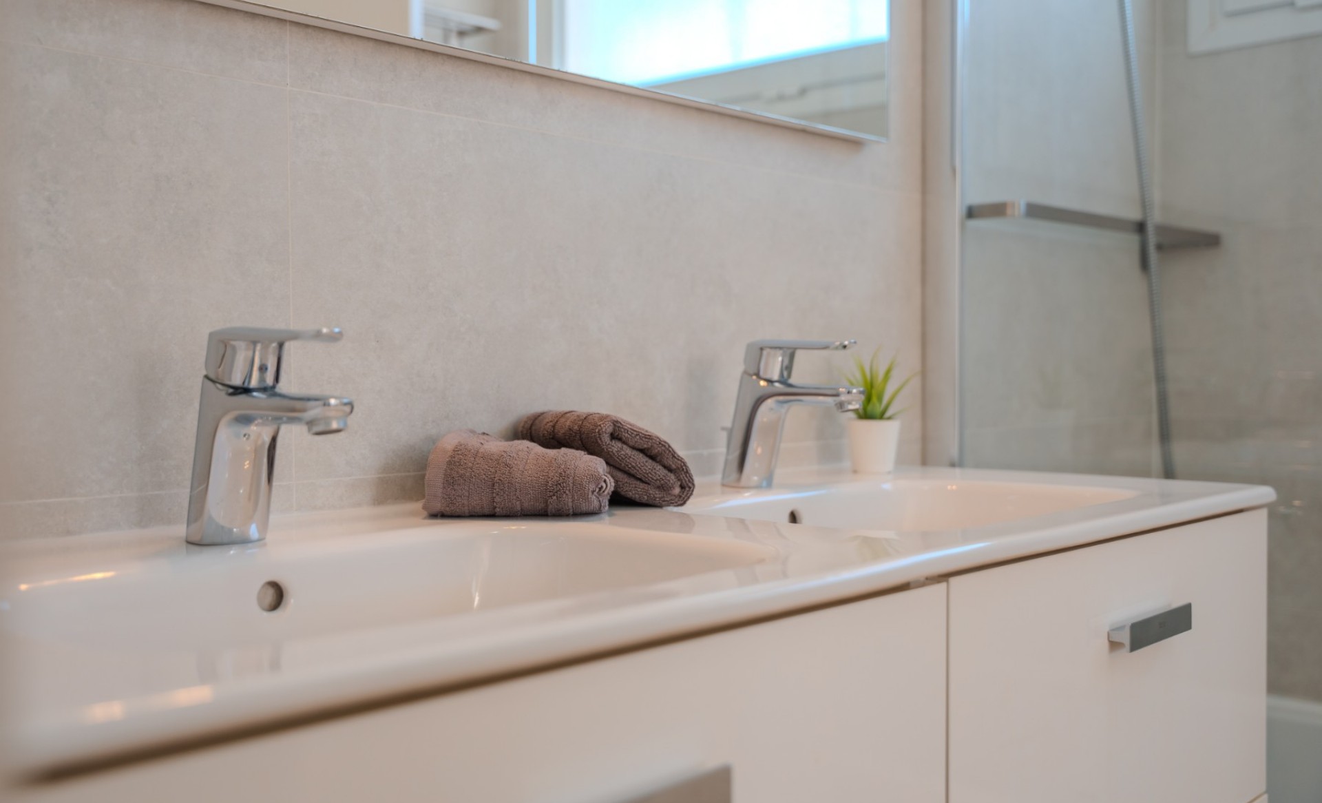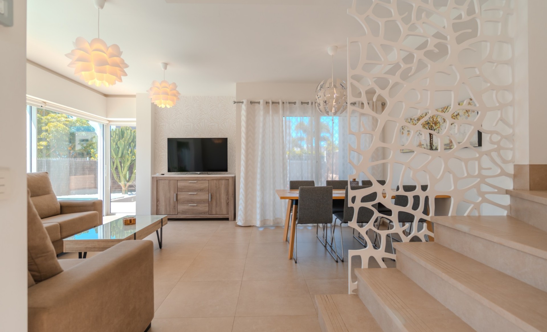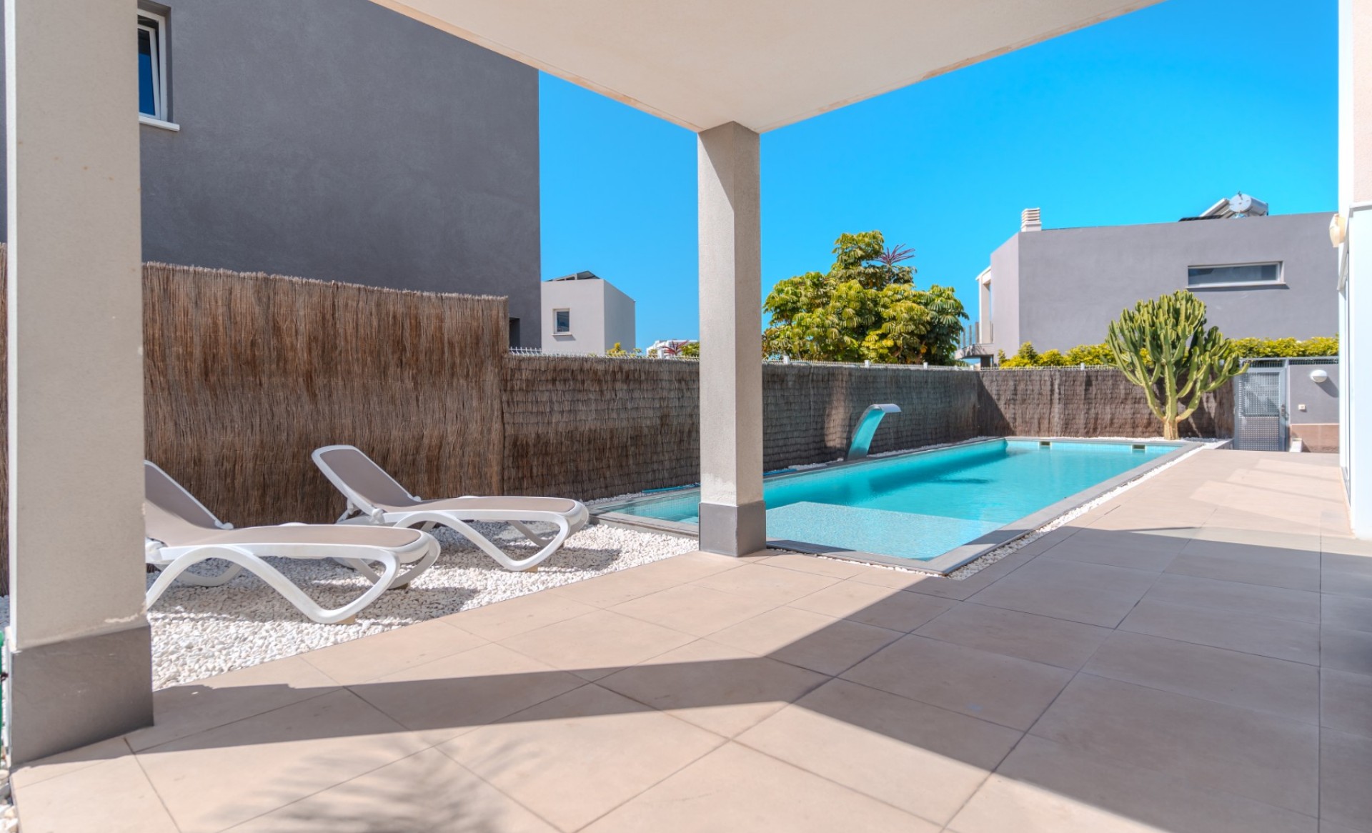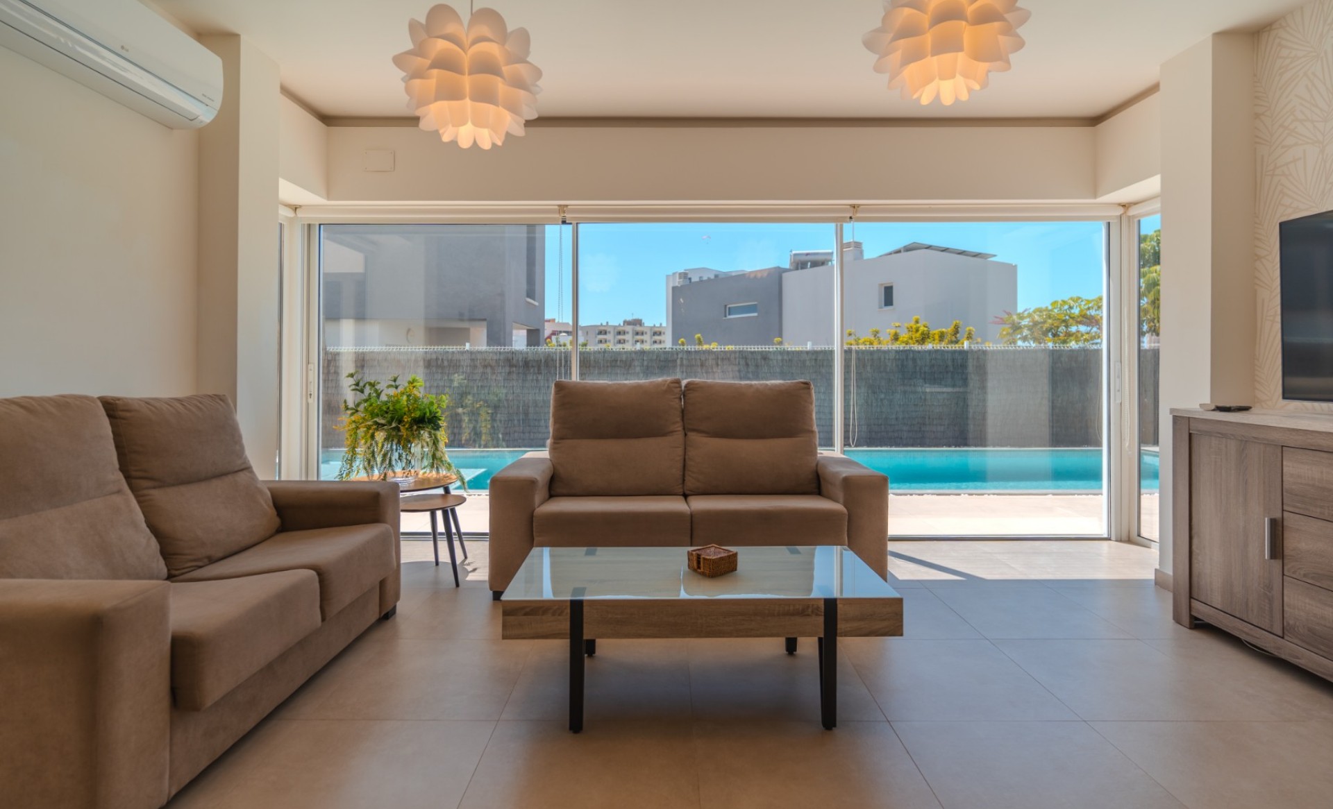 Gebouwd op een perceel van 386,85 m², biedt deze elegante villa een modern ontwerp met een bebouwde oppervlakte van 146,85 m², waarvan 104,22 m² bruikbaar woonoppervlak, verdeeld over twee verdiepingen. De begane grond (80,83 m²) beschikt over een ruime en lichte woonkamer met eetgedeelte, een volledig ingerichte keuken, een gastentoilet en een berging. De eerste verdieping (66,02 m²) heeft drie slaapkamers met inbouwkasten, twee badkamers (waarvan één en suite) en een extra berging. De hoofdslaapkamer opent naar een zonnig terras met een mooi zeezicht. De woning is uitgerust met airconditioning en zonnepanelen voor warm water, wat zorgt voor comfort en energie-efficiëntie het hele jaar door. Buiten is de villa omringd door terrassen en een tuin met een verwarmd zwembad. Aan de achterkant bevindt zich een extra berging en aan de voorkant is er ruimte om minimaal twee auto’s te parkeren. Gelegen in de exclusieve, afgesloten gemeenschap Nirvana Paraíso, direct tegenover het winkelcentrum Las Rosas, met winkels, bars en restaurants binnen handbereik. Het Las Galgas-strand en het Hard Rock Hotel liggen op slechts 10 minuten lopen. Een ideale woning om permanent in te wonen of als investering, aangezien deze beschikt over een vergunning voor toeristische verhuur.
